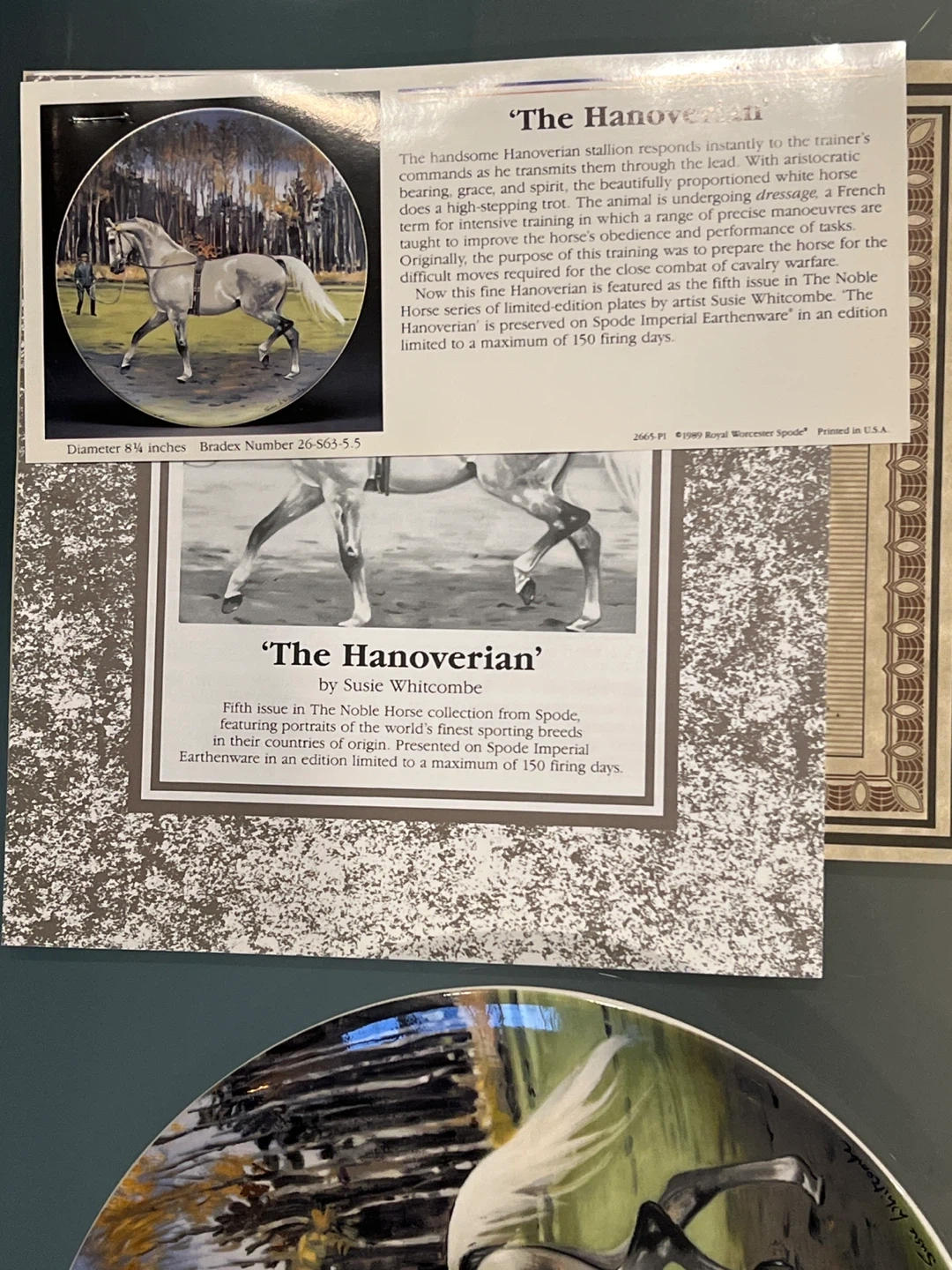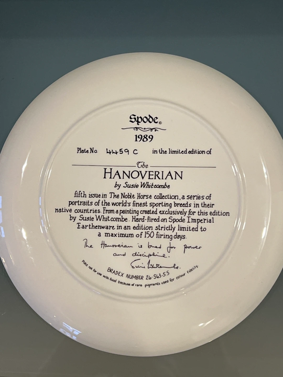 Selling a beautiful Spode plate titled 'The Hanoverian' by Susie Whitcombe. It's the fifth issue in The Noble Horse collection. This plate is from 1989 and is part of a limited edition of Spode Imperial Earthenware. The diameter is 8 1/4 inches and the Bradex number is 26-S63-5.5