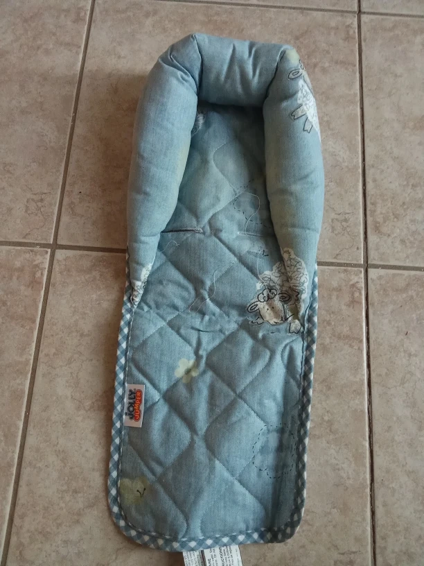 Selling a Jolly Jumper head support. It has a cute design with sheep and flowers on a light blue quilted fabric. Perfect for keeping your little one comfy and secure!
