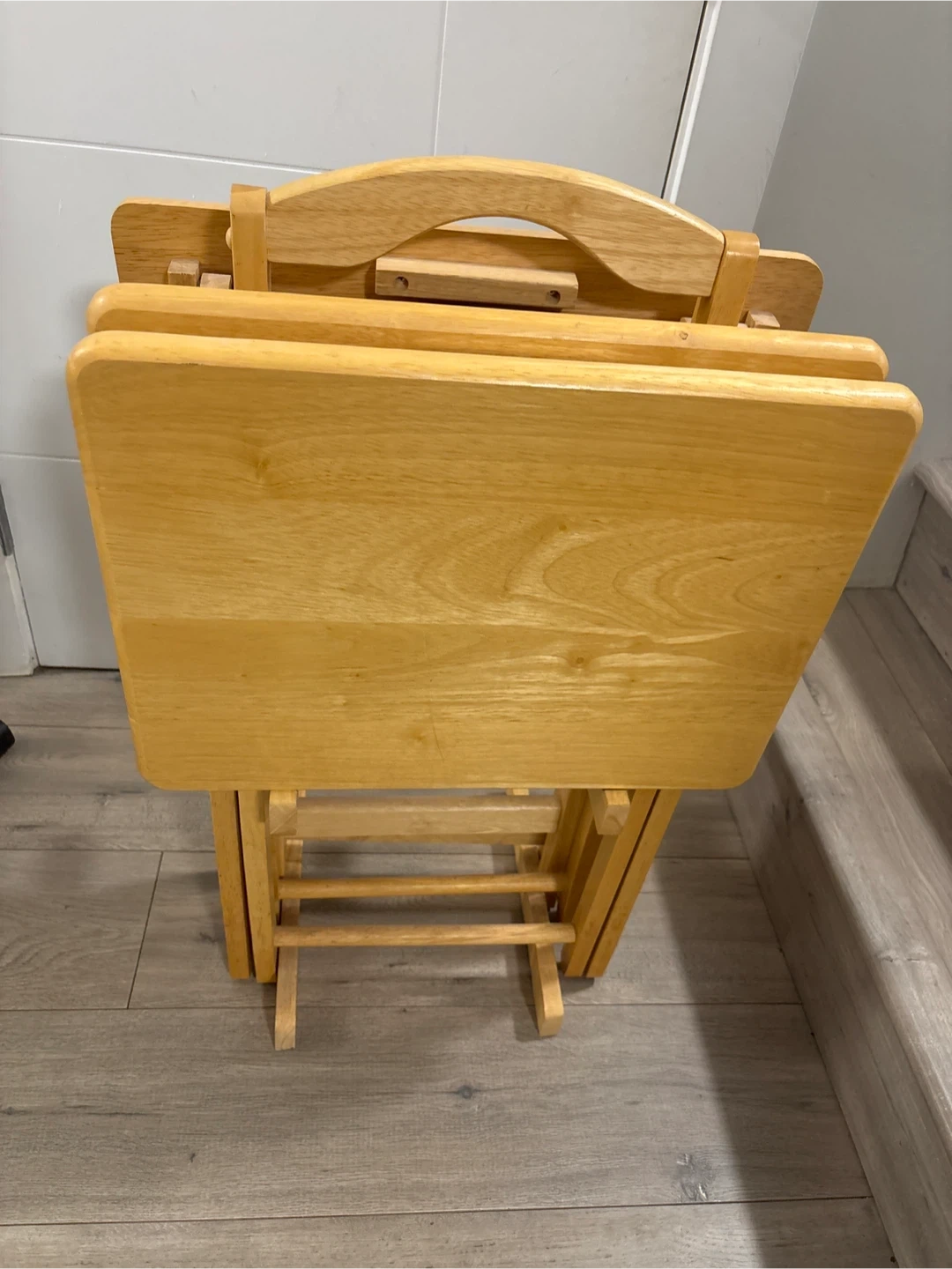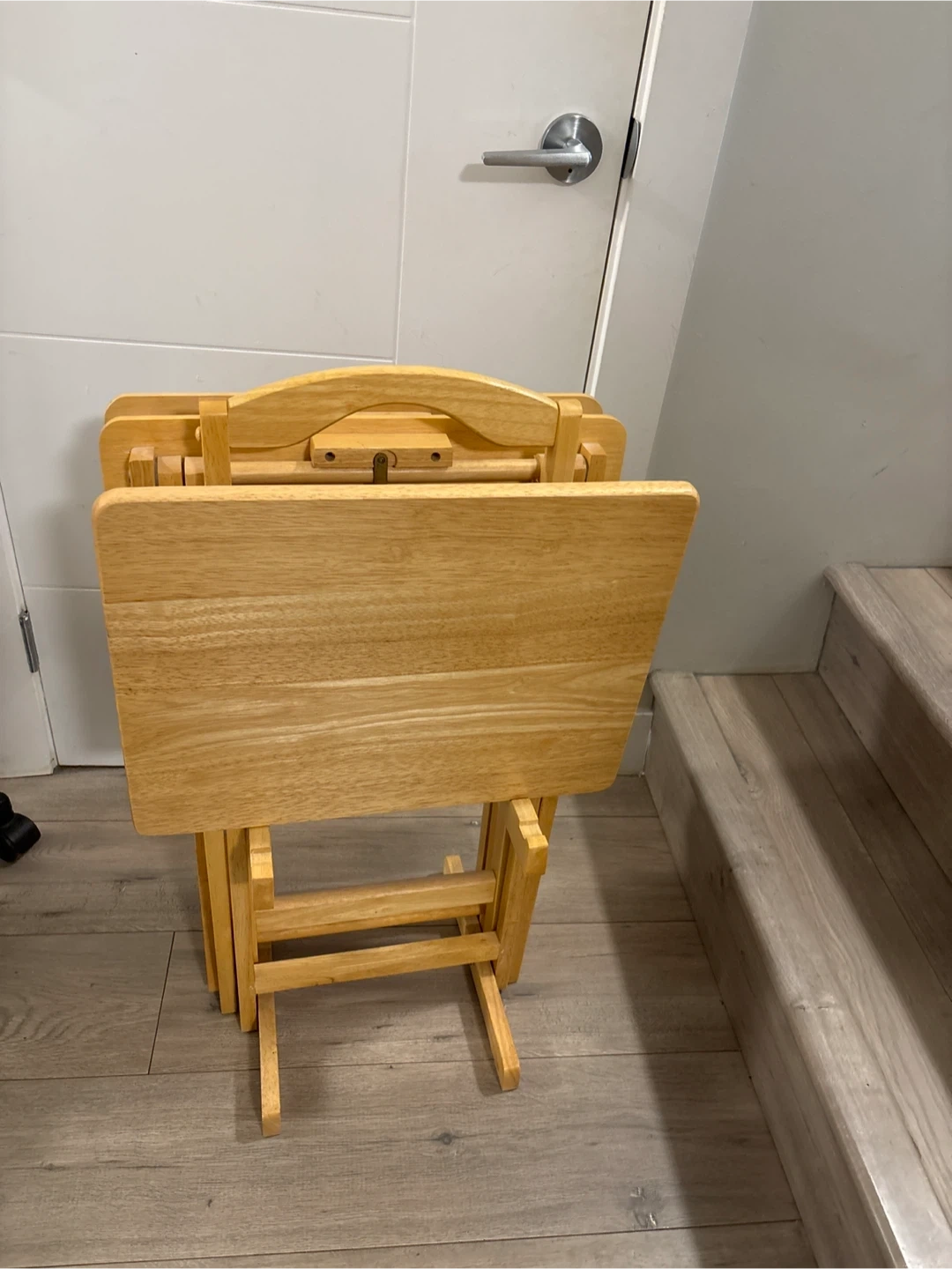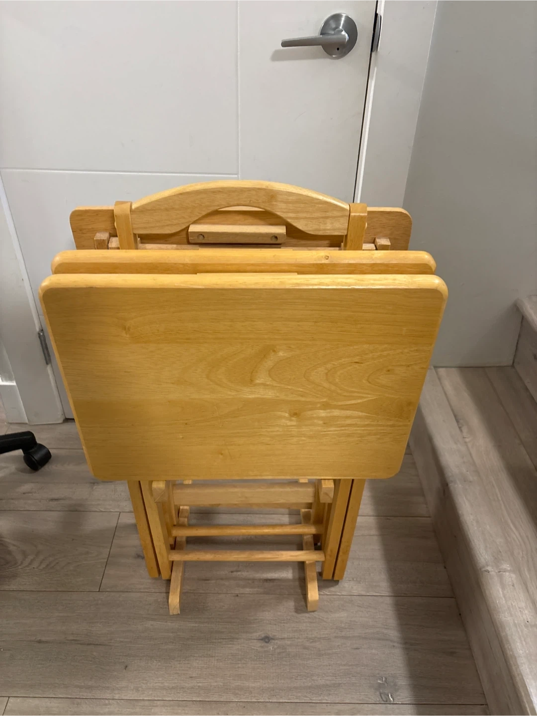 Selling a set of Three wooden folding TV tray tables. They're perfect for snacks, meals, or working from the couch. Easy to store on the stand and in great shape!
