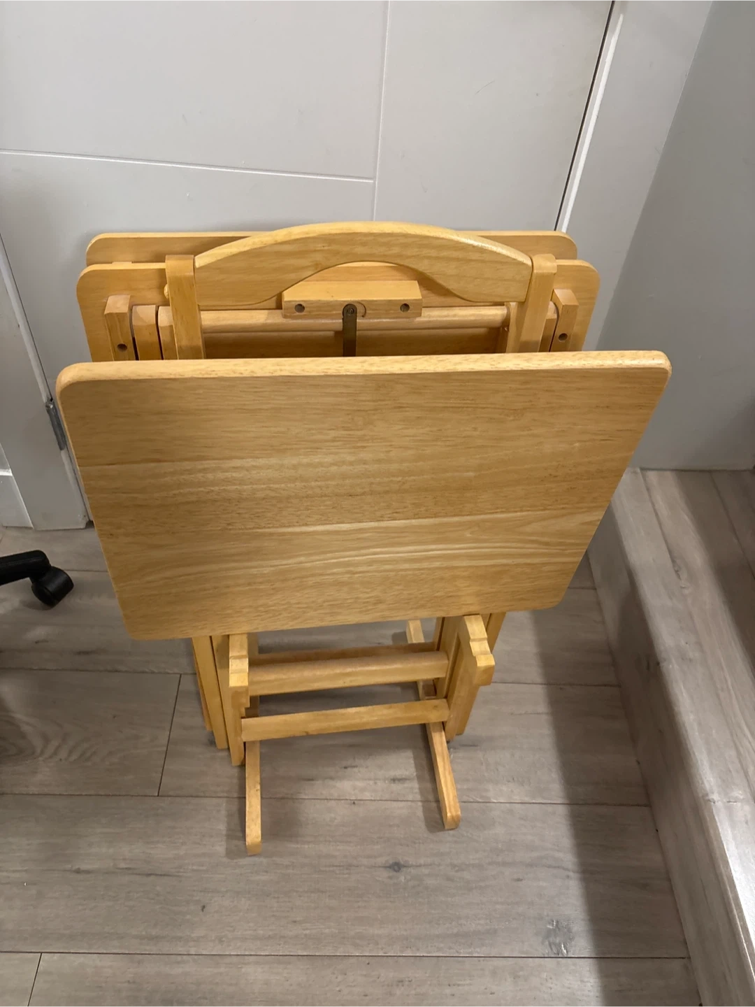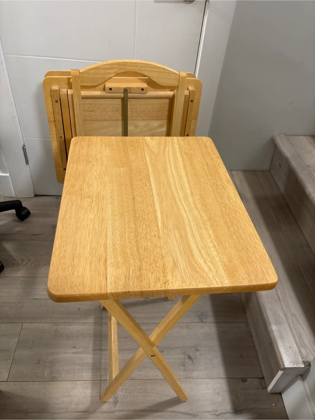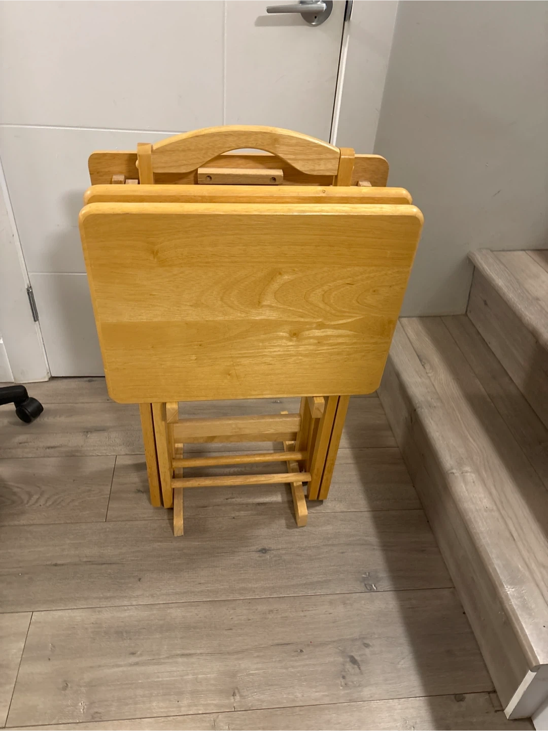 Selling a set of Three wooden folding TV tray tables. They're perfect for snacks, meals, or working from the couch. Easy to store on the stand and in great shape!