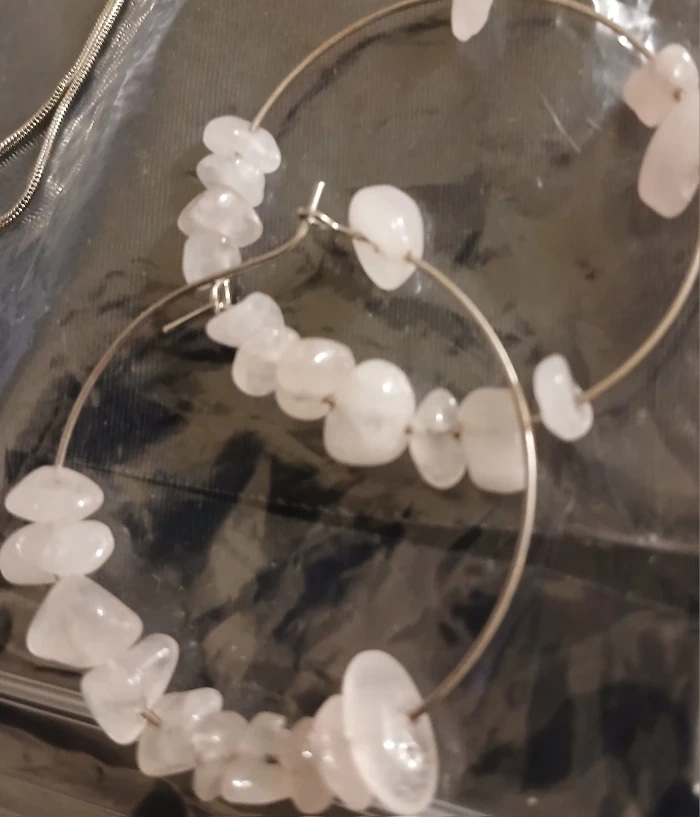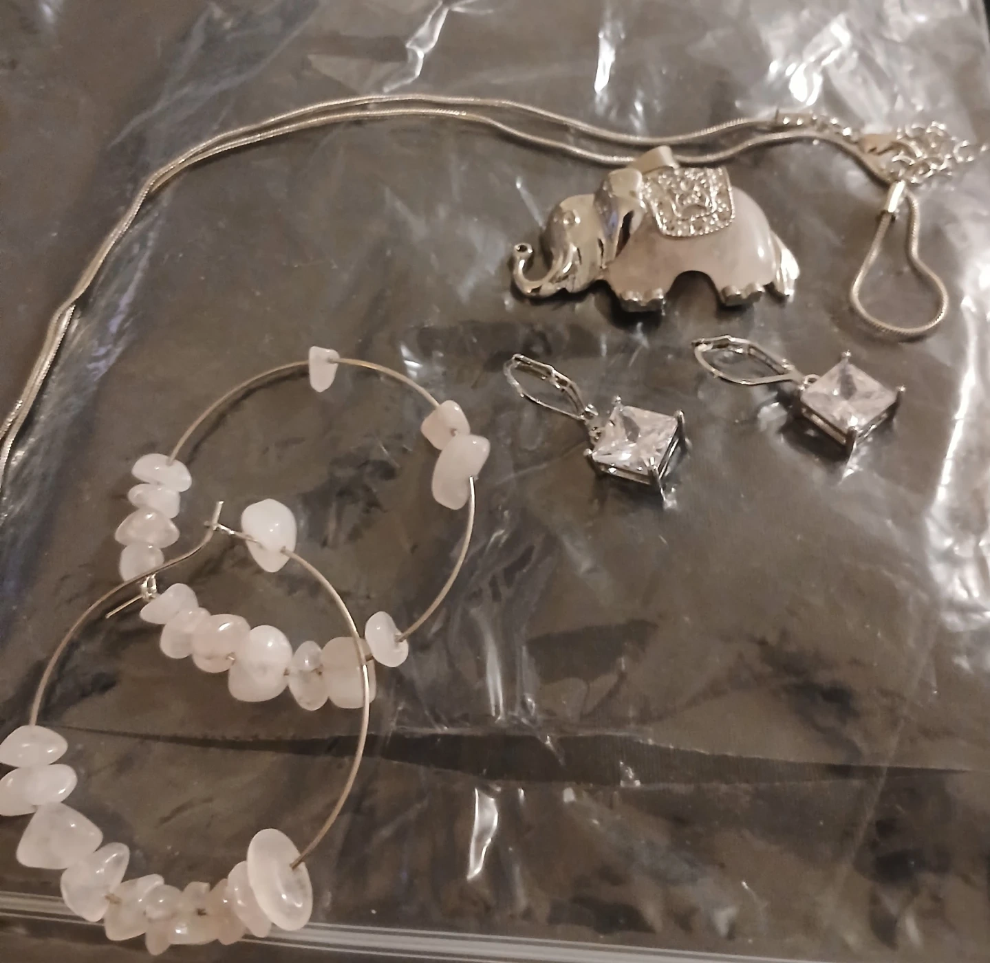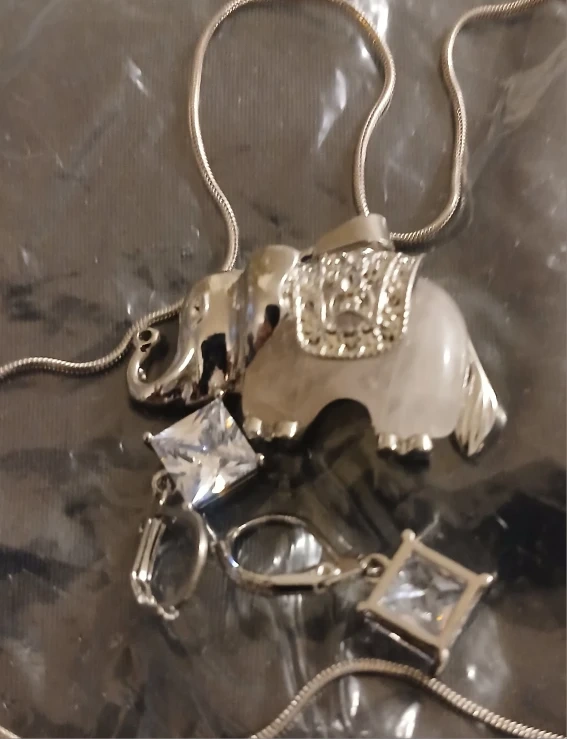 Here's a cute set of jewellery! It includes a necklace with an elephant pendant, a pair of square cubic zirconia earrings, and a pair of rose quartz hoop earrings. Perfect for adding a little sparkle to your day!