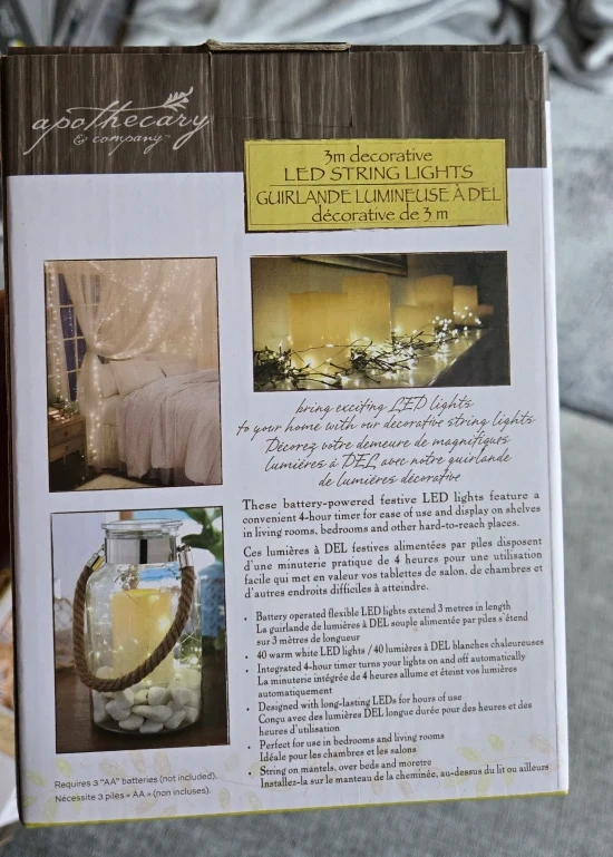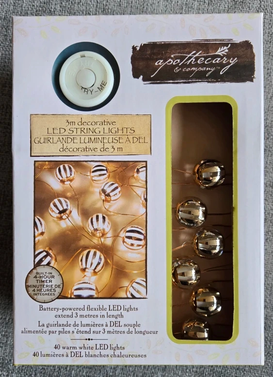 3m/10' (ish) decorative LED string lights from Apothecary & Company. They're battery-powered and require 2 AAA which are not included.