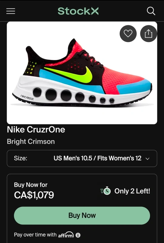 Selling a pair of ultra rare Nike CruzrOne in Bright Crimson. These things are getting impossible to find and the resale market is wild right now. They are going for over a thousand bucks on StockX, but I’m letting mine go for 400 because I trashed the box and wore them outside a few times. Lightly used, super clean, zero issues. If you know this model you already know how rare they are. Price is firm because this is already less than half of current resale. First come, first served.