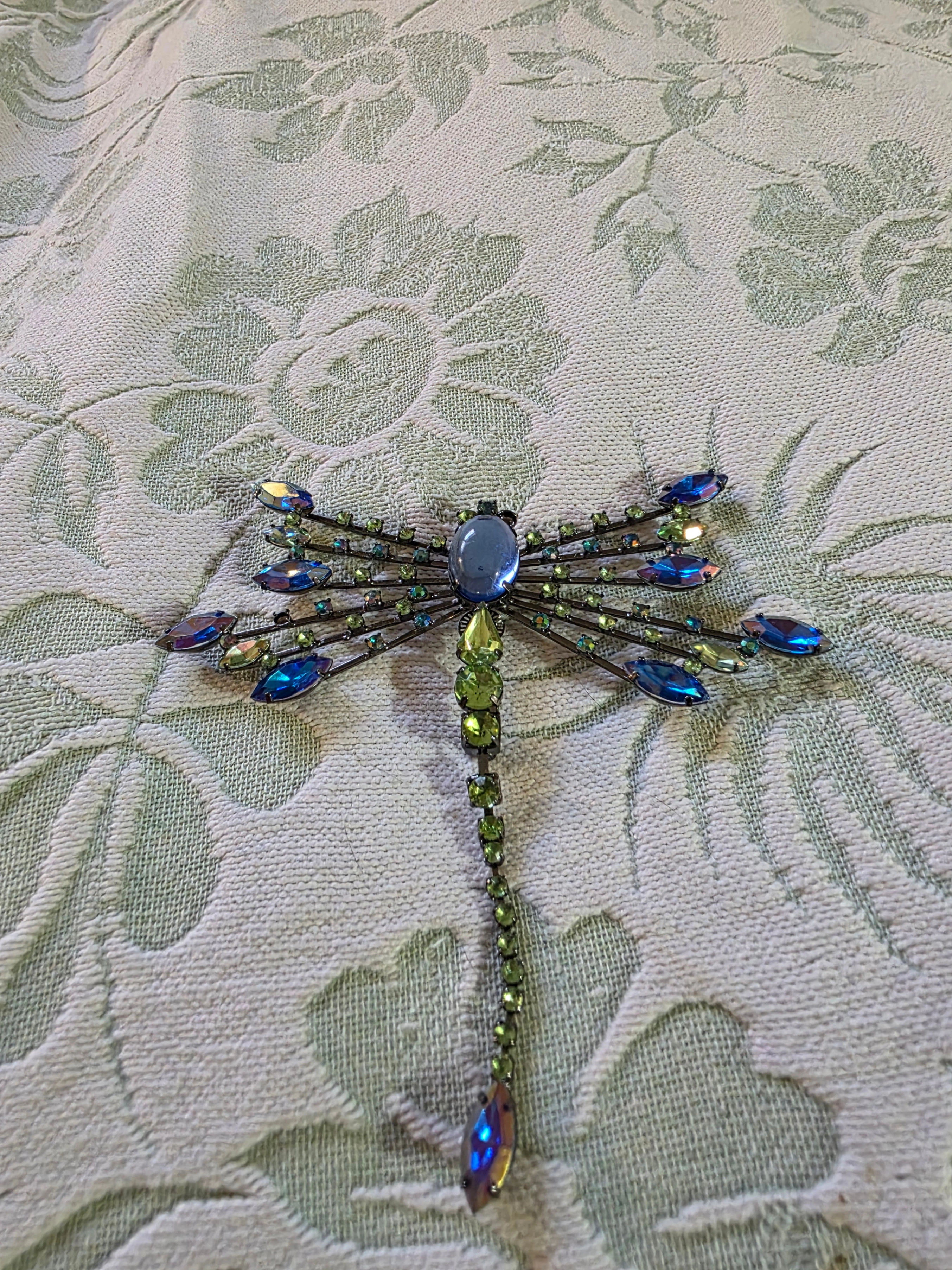 A beautiful dragonfly brooch featuring sparkling blue and green stones. This eye-catching piece would add a touch of whimsy to any outfit. Perfect for pinning on a jacket, scarf, or bag!