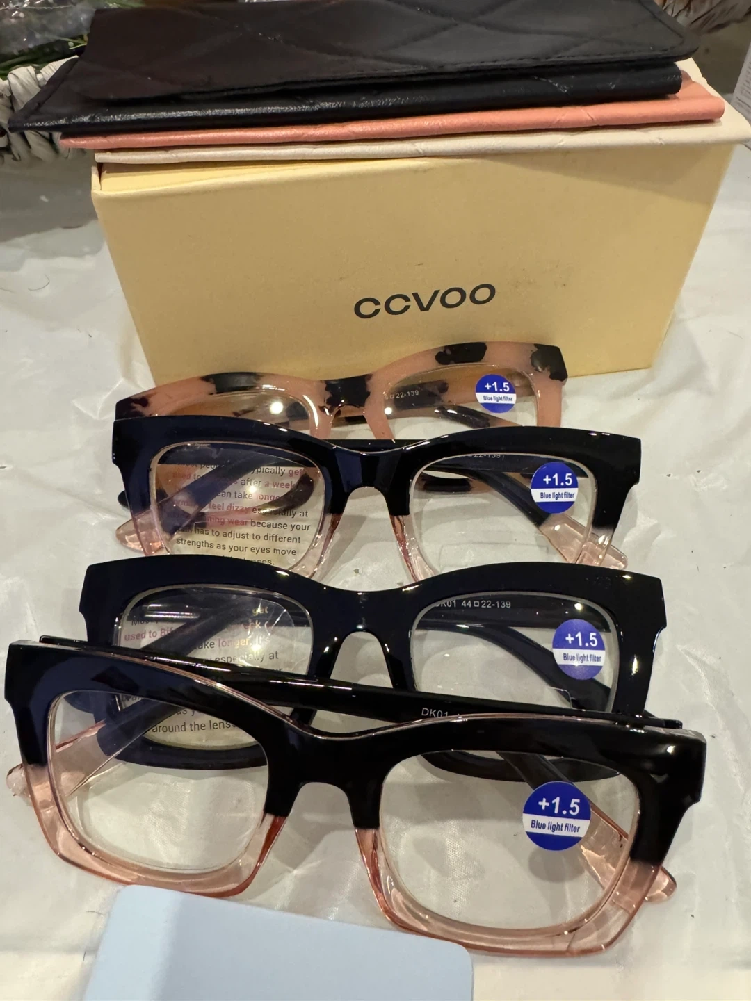 I'm selling a pair of CCVOO glasses with +1.5 blue light filters. come with their original box! The OCR text mentions they're designed to help your eyes adjust to different strengths, making them comfortable for extended wear. These glasses have a stylish design. Perfect for anyone looking for some blue light protection!