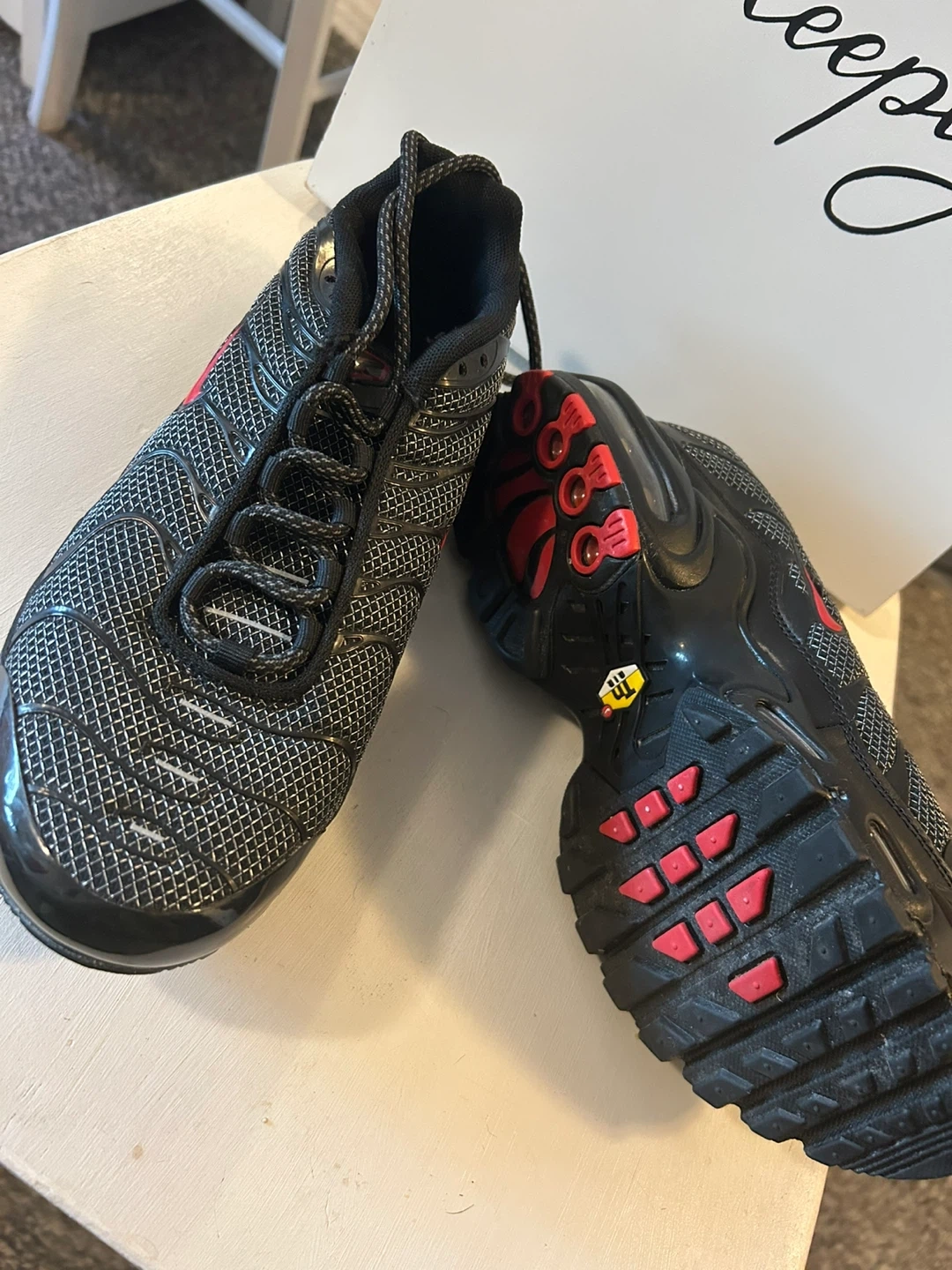 Selling a pair of Nike Air Max Plus TN in black with red accents! They are a US size 6Y and in great condition. Perfect for everyday wear!