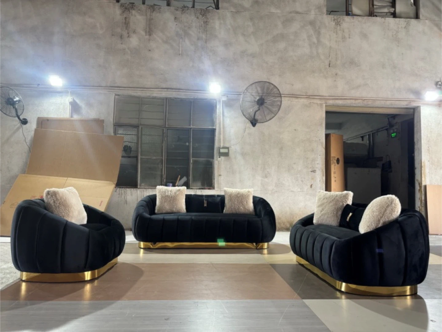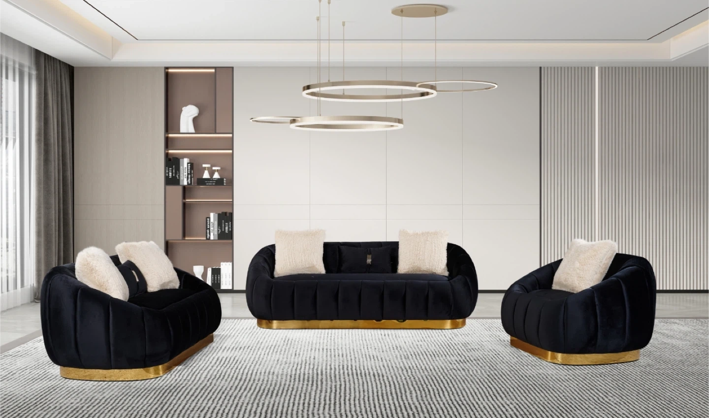 Add a touch of elegance to your living space with this beautiful velvet sofa set. The set includes a sofa Loveseat and matching chair , all in a stylish black , beige or grey colour with gold accents