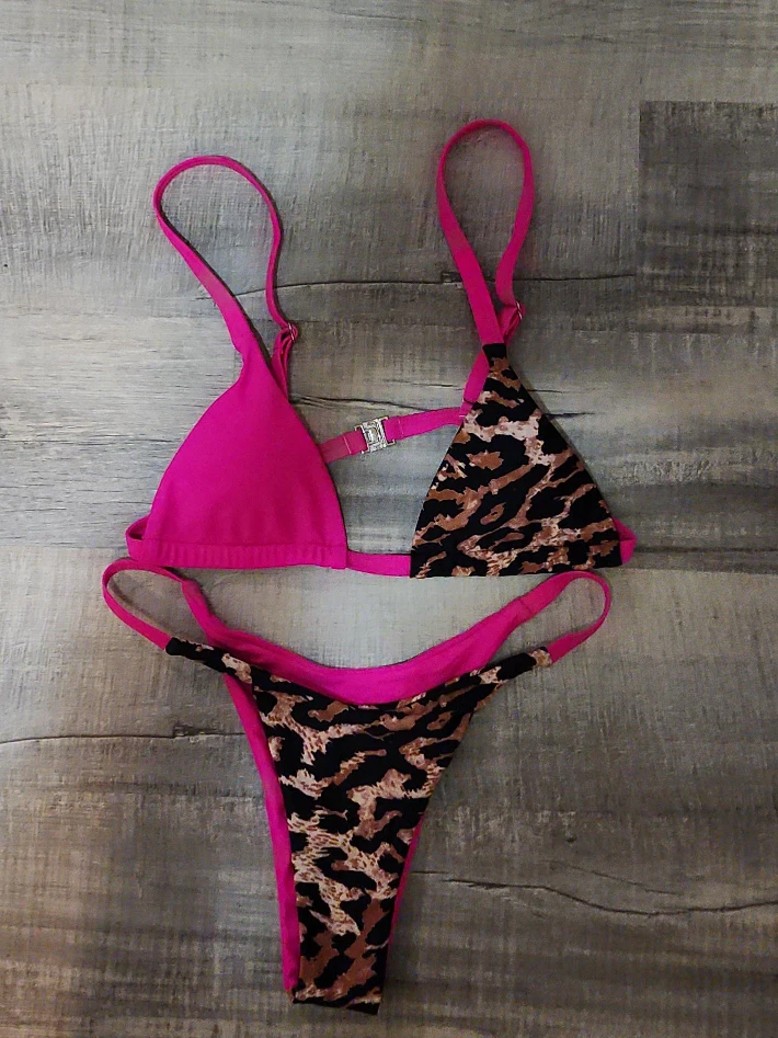 Here's a cute bikini set featuring a mix of pink and leopard print! It's in good condition and ready for summer days at the beach or pool