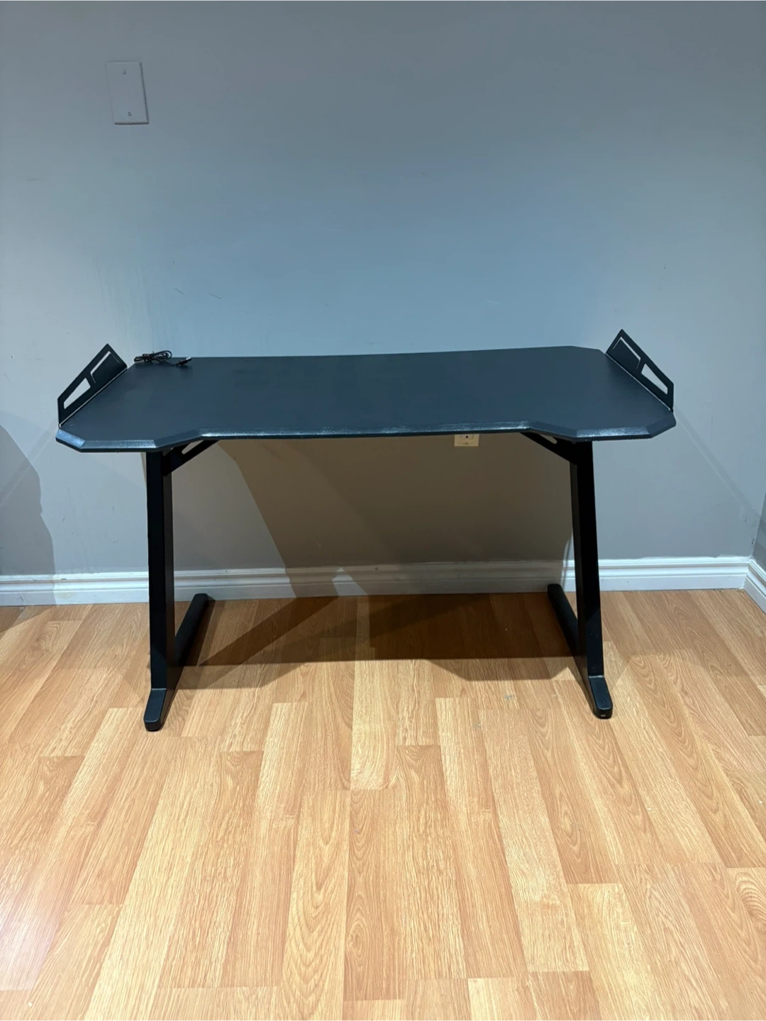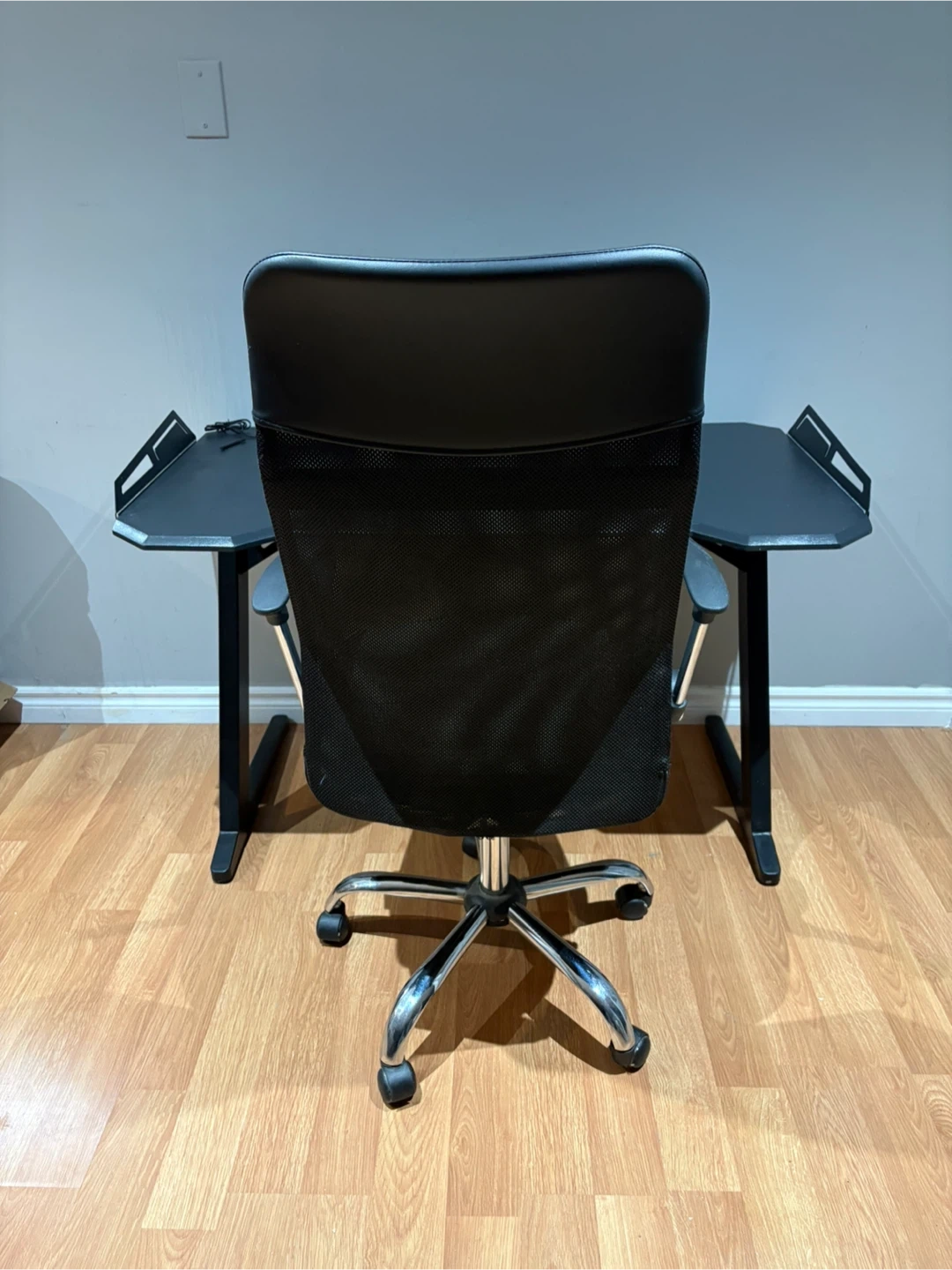 Selling a black office chair and gaming desk. They're in good condition and would be great for a gaming setup. The chair has a mesh back for comfort, and the desk is a good size for working or gaming. Let me know if you're interested!