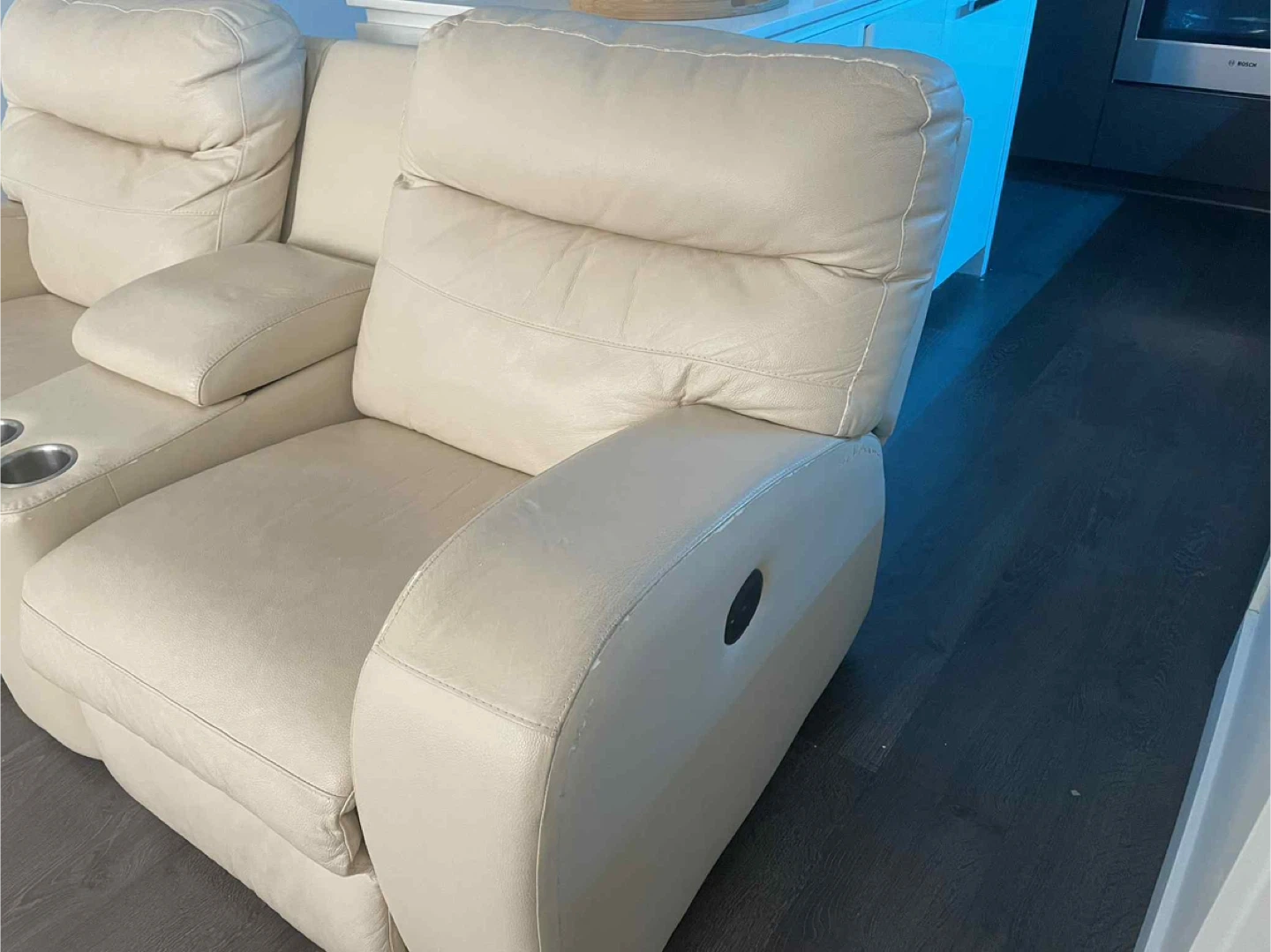 Selling a comfy beige leather reclining loveseat. It features a centre console with cupholders. Perfect for a movie night!