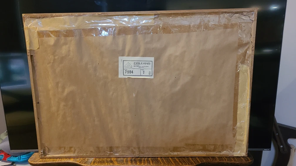 Framed print featuring a fan design. The frame is off-white. The print has a light blue background with white clouds and pink flowers. A nice piece to add to your home decor!