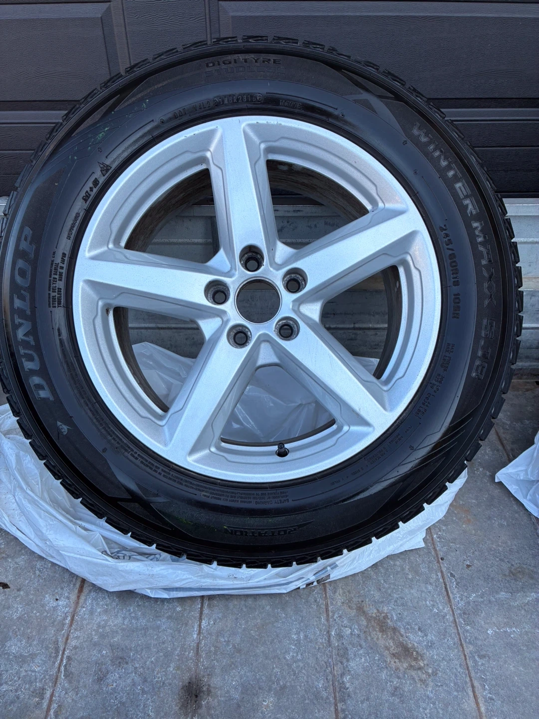 Selling a set of 4 Dunlop Winter Maxx tires, size 265/60R18, mounted on 18" 5-spoke painted aluminum Ford rims.