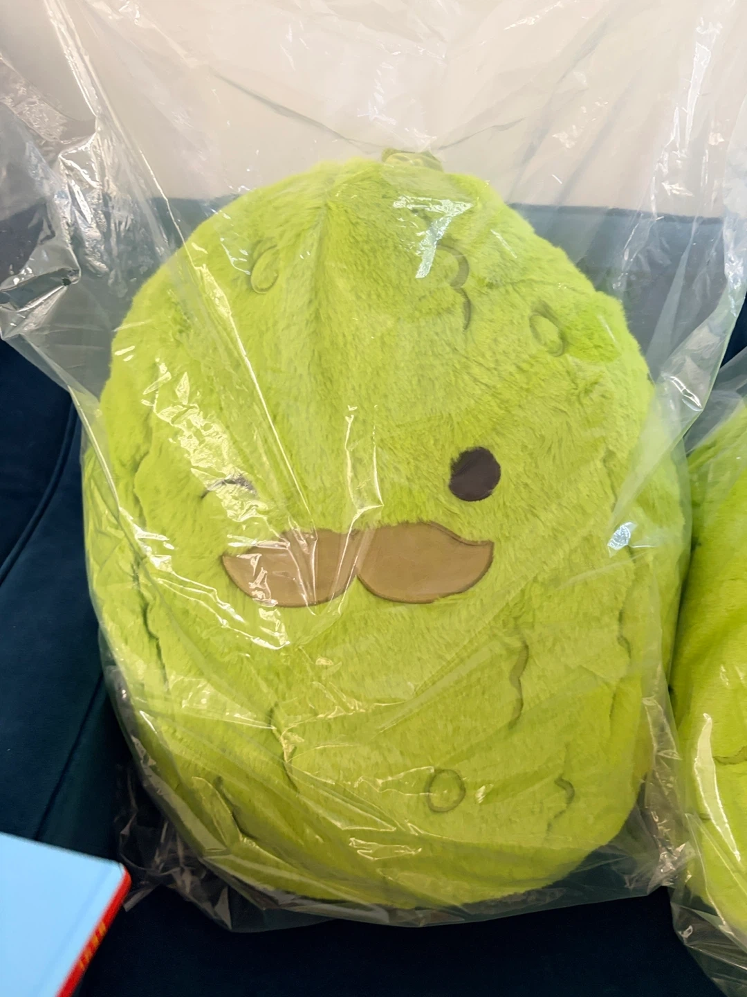 This is a soft, green plush toy. It's made of fuzzy material and features a cute embroidered face. Its round shape makes it huggable and fun for display.