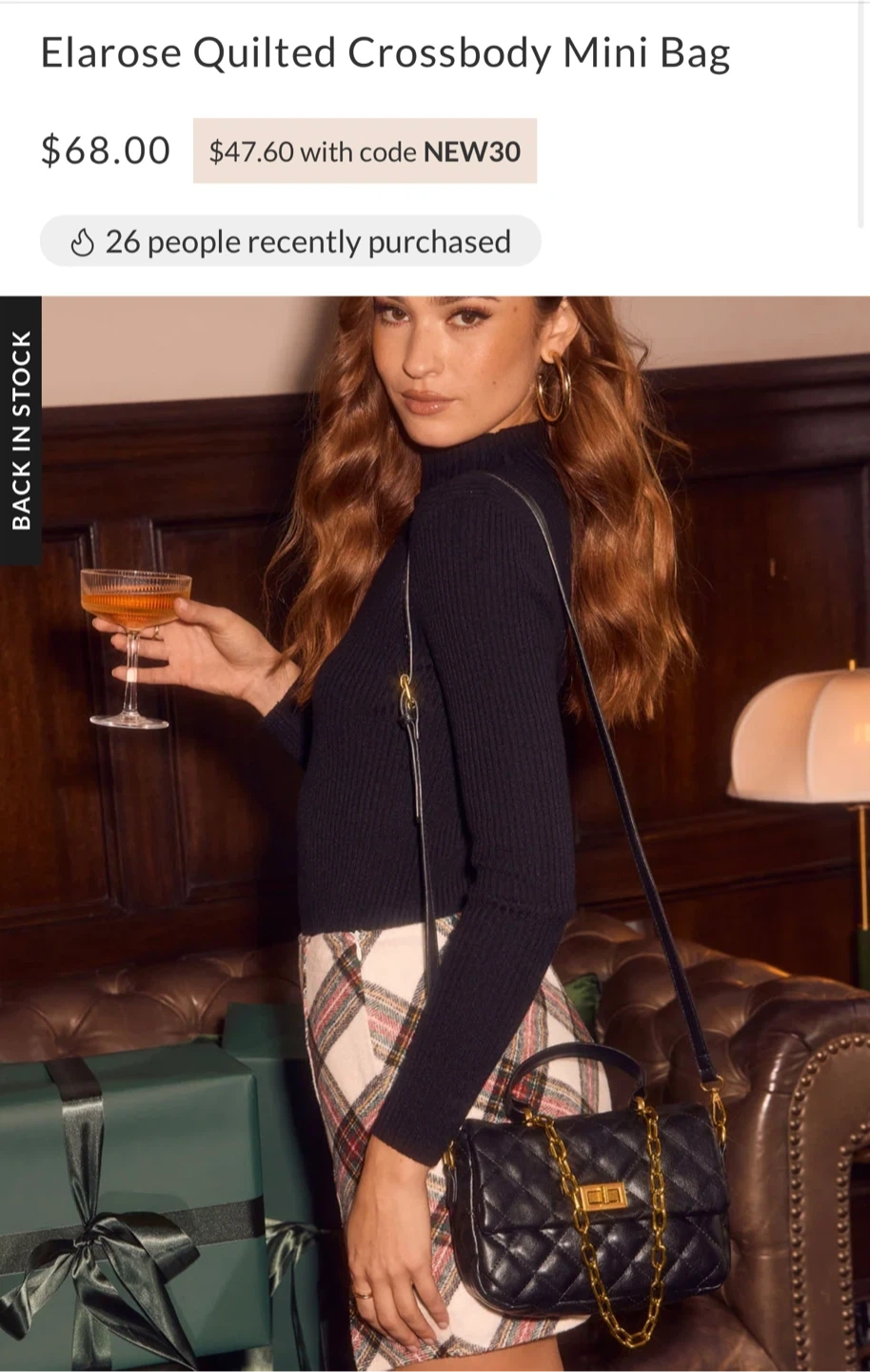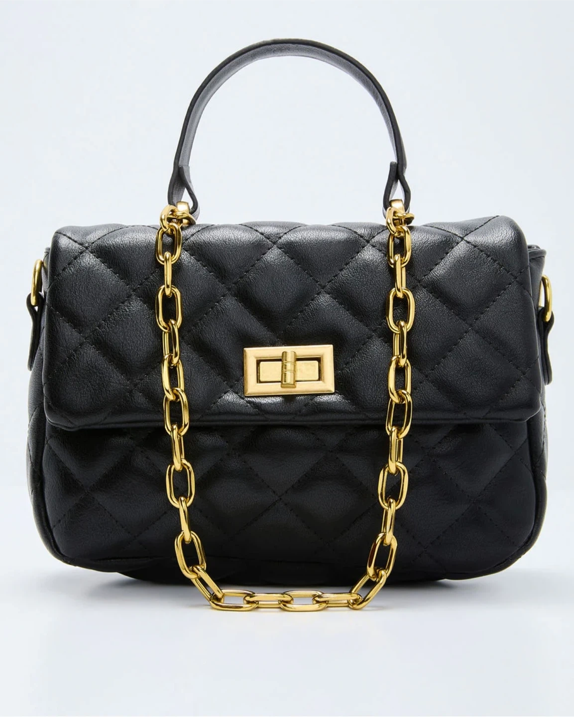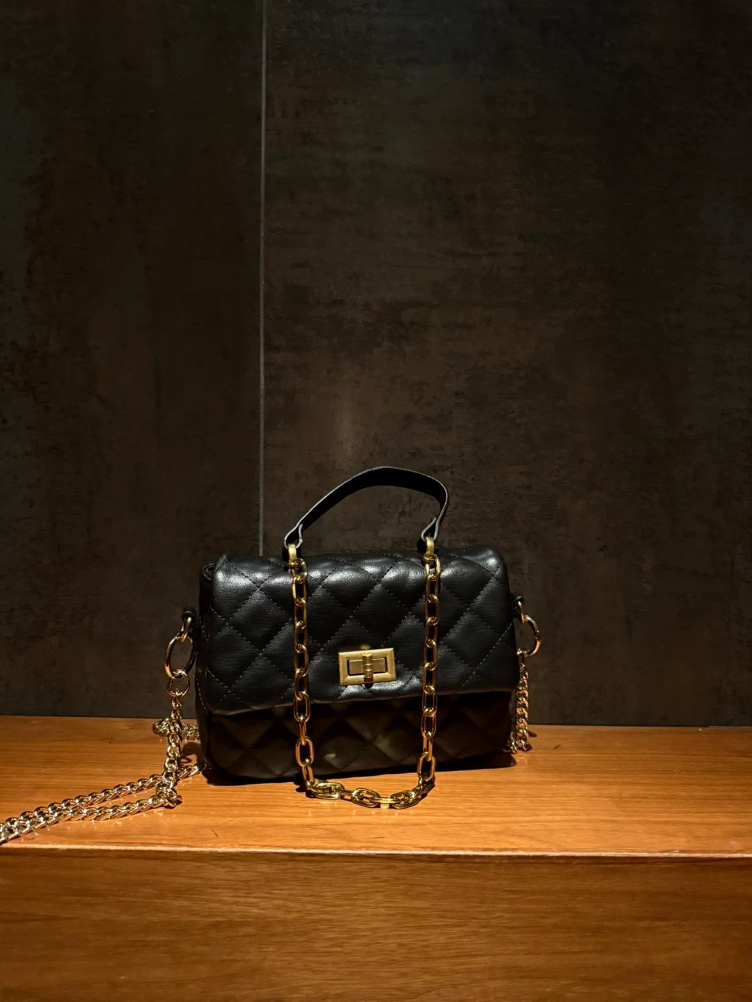 This is a cute crossbody mini bag in black with a gold chain! It's in great condition and would be a stylish addition to any outfit