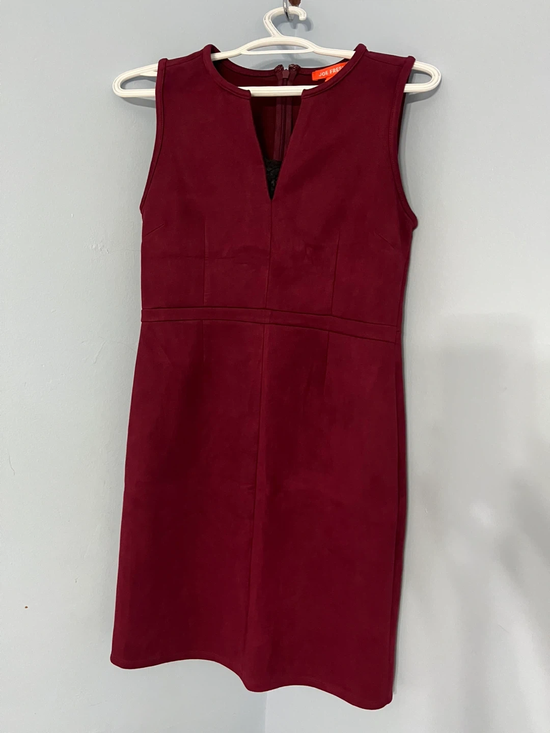 A stylish burgundy dress from Joe Fresh! This dress features a v-neck design and is made from a soft material. I added the black lace on the v neck it can be remove.