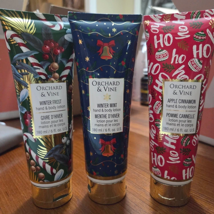 Selling a set of three Orchard & Vine hand and body lotions! Each tube contains 180 ml / 6 fl oz. U.S. The set includes Winter Frost, Winter Mint, and Apple Cinnamon scents. Perfect for keeping your hands moisturized this winter season
