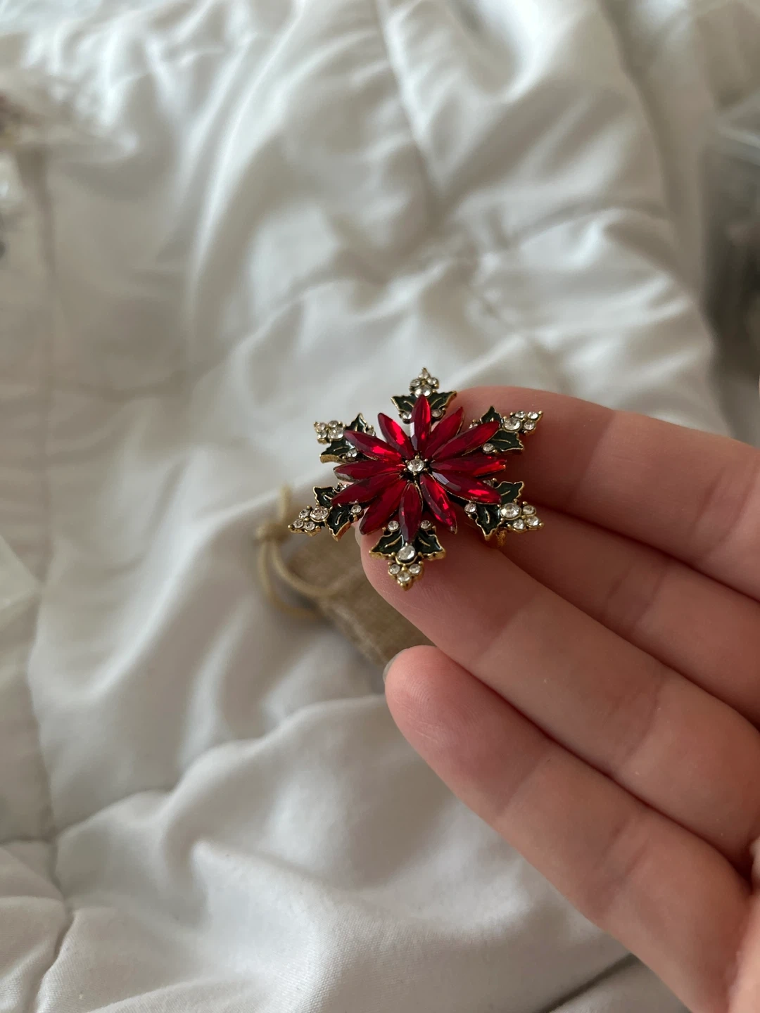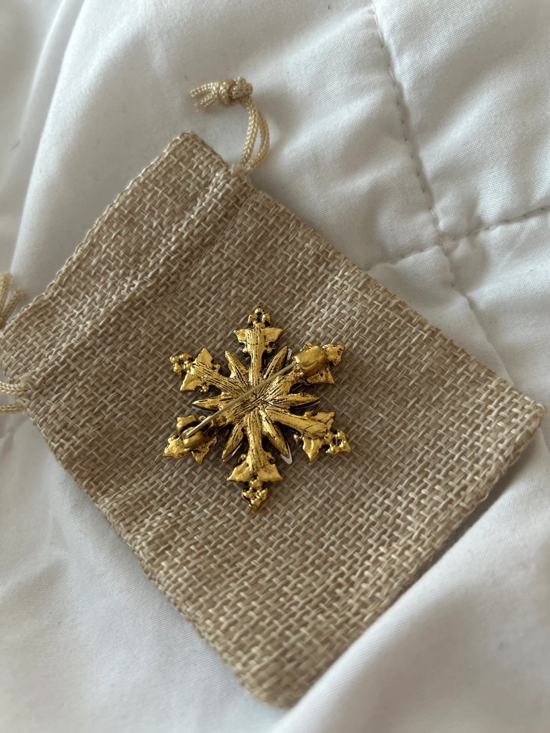 A festive red snowflake brooch! It features red and clear gems, with a gold-tone backing. Perfect for adding a bit of holiday sparkle to your outfit or bag. Comes with a small drawstring bag for safekeeping