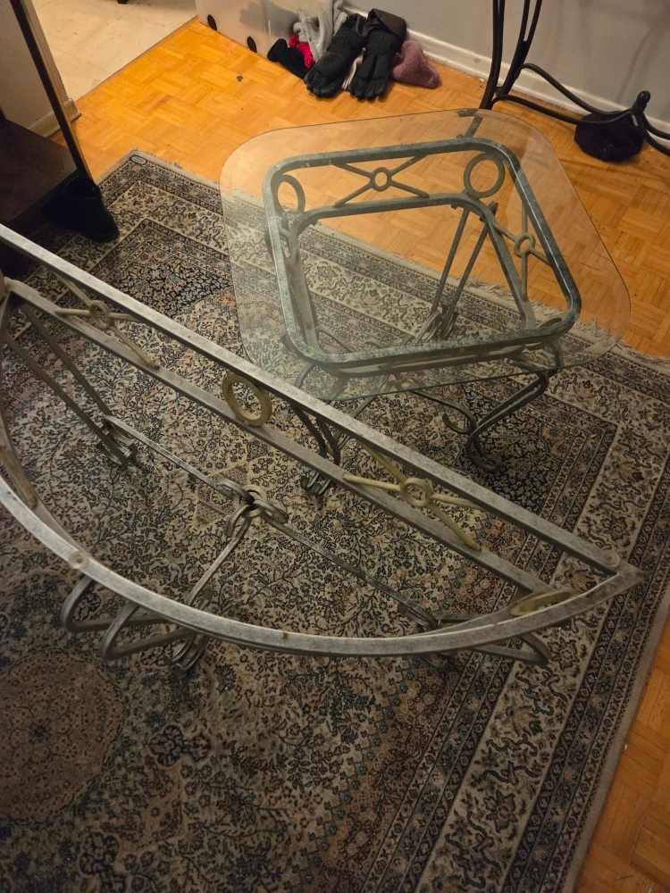 Selling a coffee table and matching side table with glass tops and metal frames. They've got a unique, decorative design that would add a touch of elegance to any living room. The set is in good condition and ready for a new home!