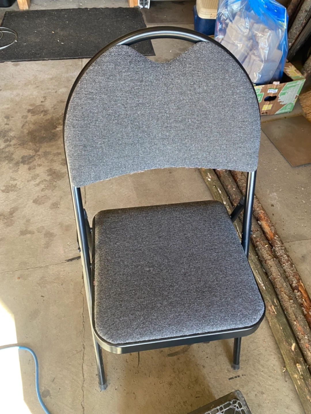 Selling a folding chair with a grey fabric seat and back. It's in good condition and perfect for extra seating when you have guests over!
