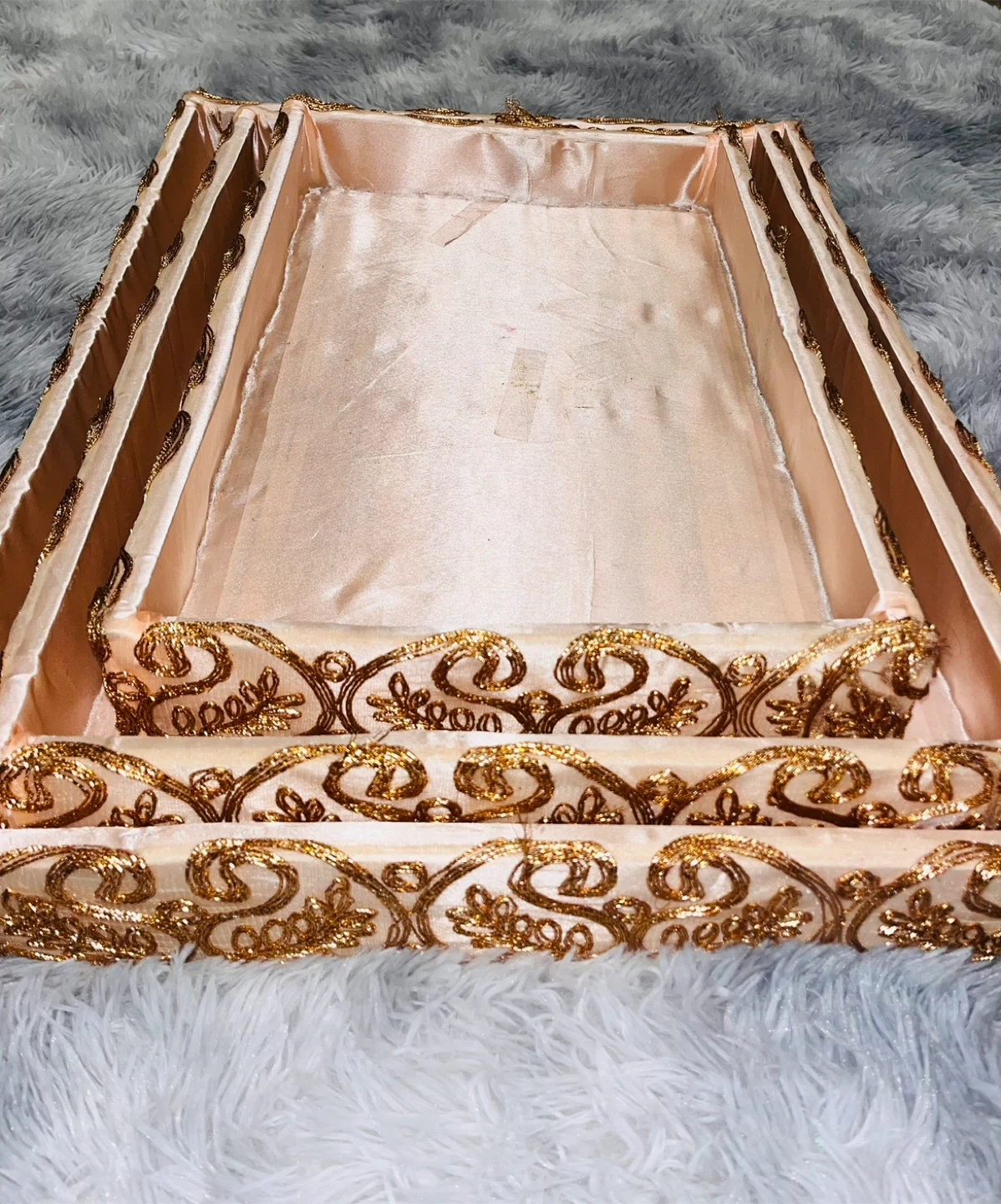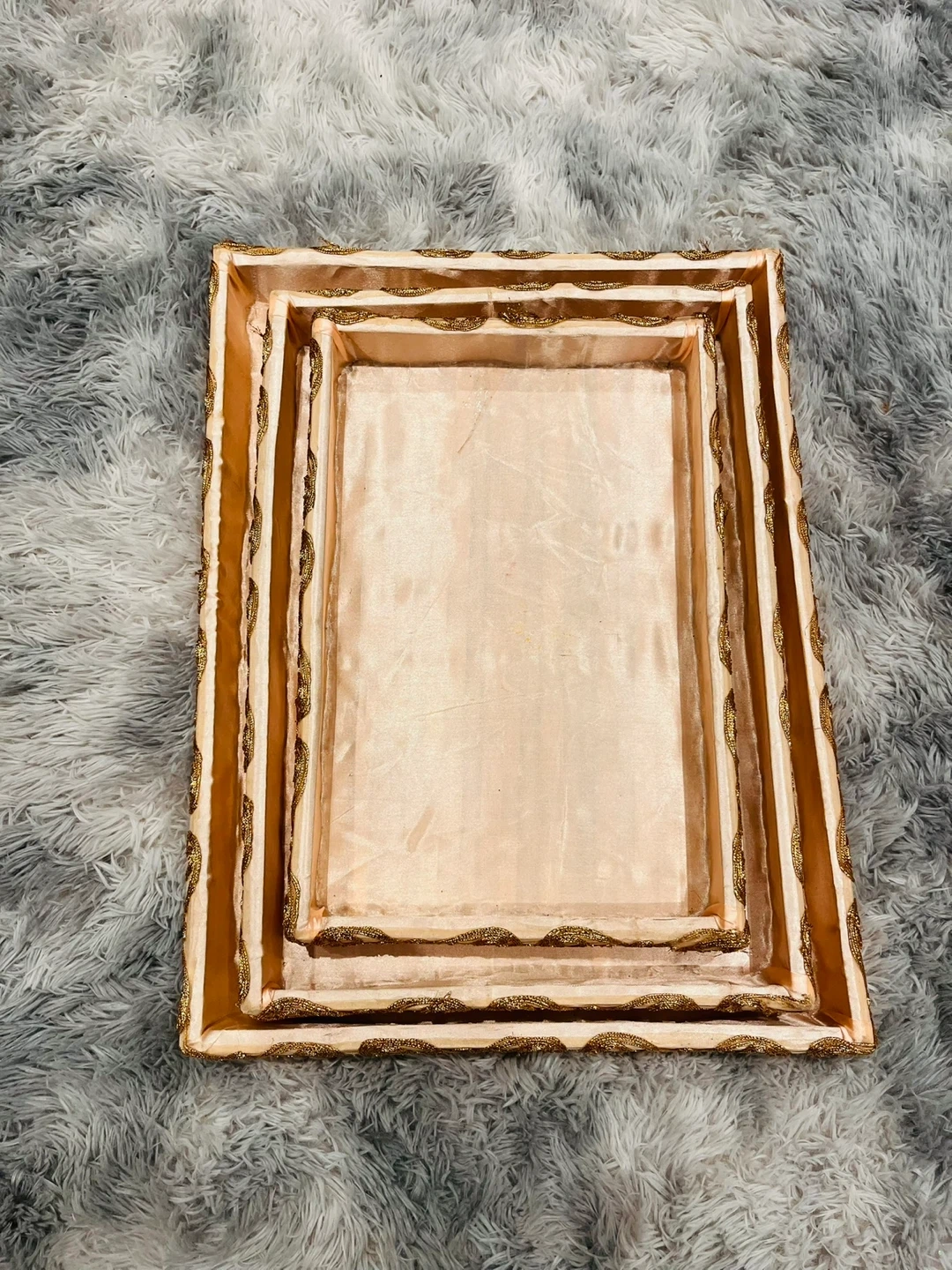 These are a set of three decorative dala trays. They have a lovely gold trim and a soft peach-coloured interior. Perfect for adding a touch of elegance to your events!