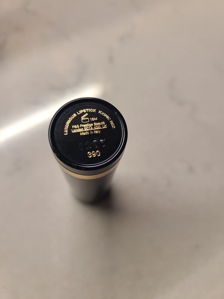 Gucci Luxurious Lipstick in the shade 390 Iconic Red! It's a beautiful red colour and the packaging is so elegant. Perfect for adding a pop of colour to your look!