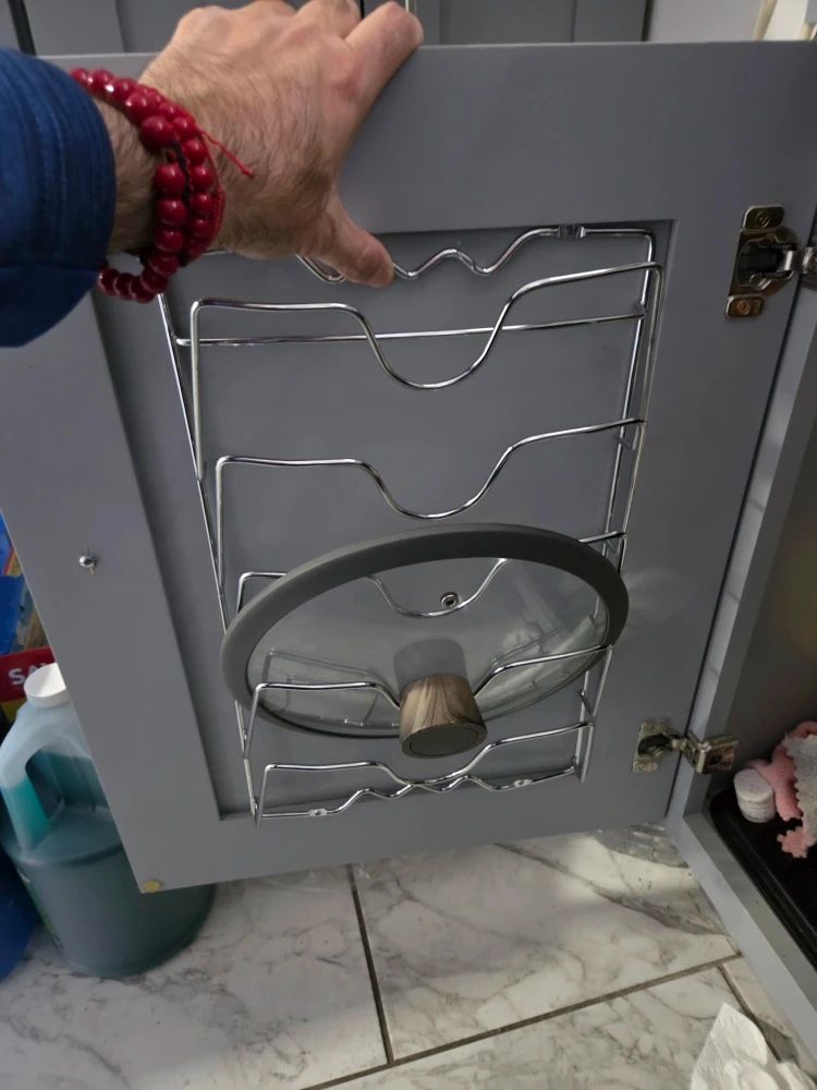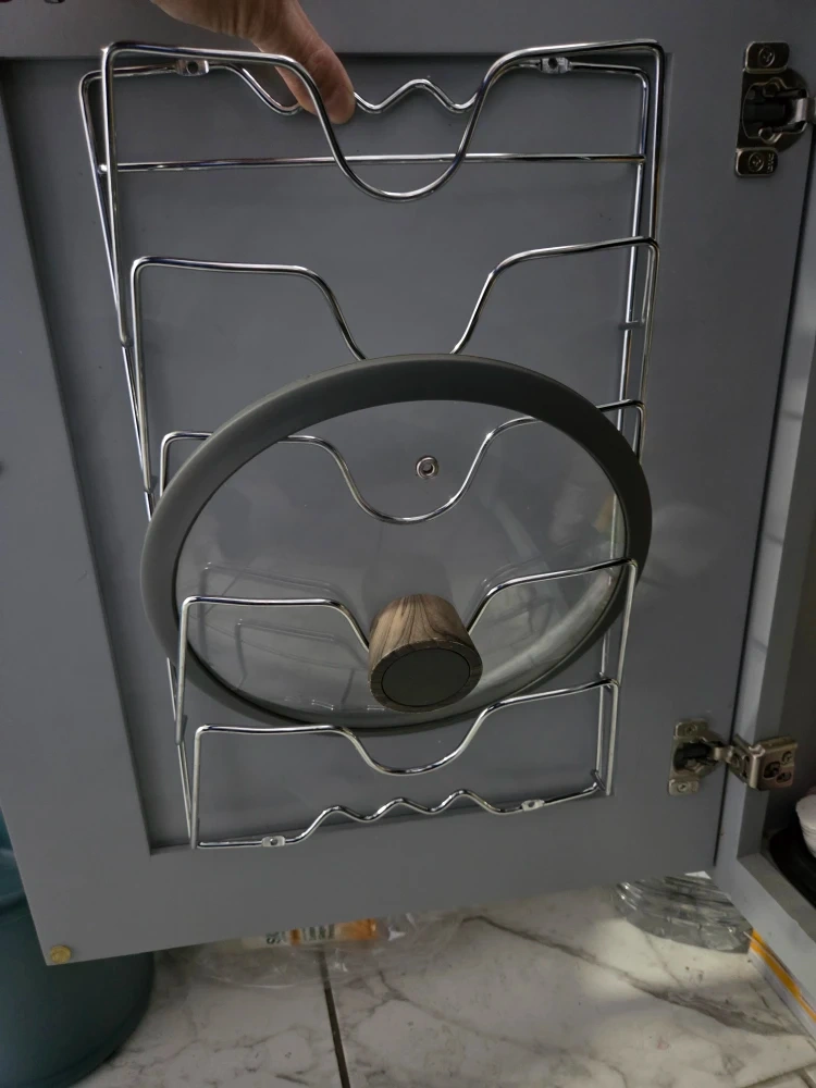 This pot lid rack organizer is perfect for keeping your kitchen cabinet neat and tidy! It mounts inside the cabinet door, saving space and making it easy to find the lid you need. It's in great condition and ready to use