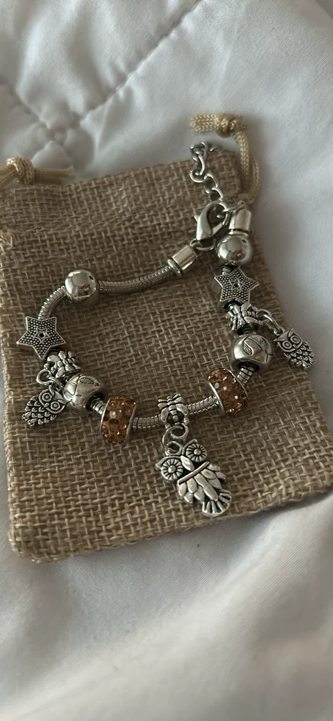 Selling a lovely charm bracelet! It features a variety of charms, including stars, owls, and decorative beads. The bracelet is in great condition and comes with a small pouch for storage