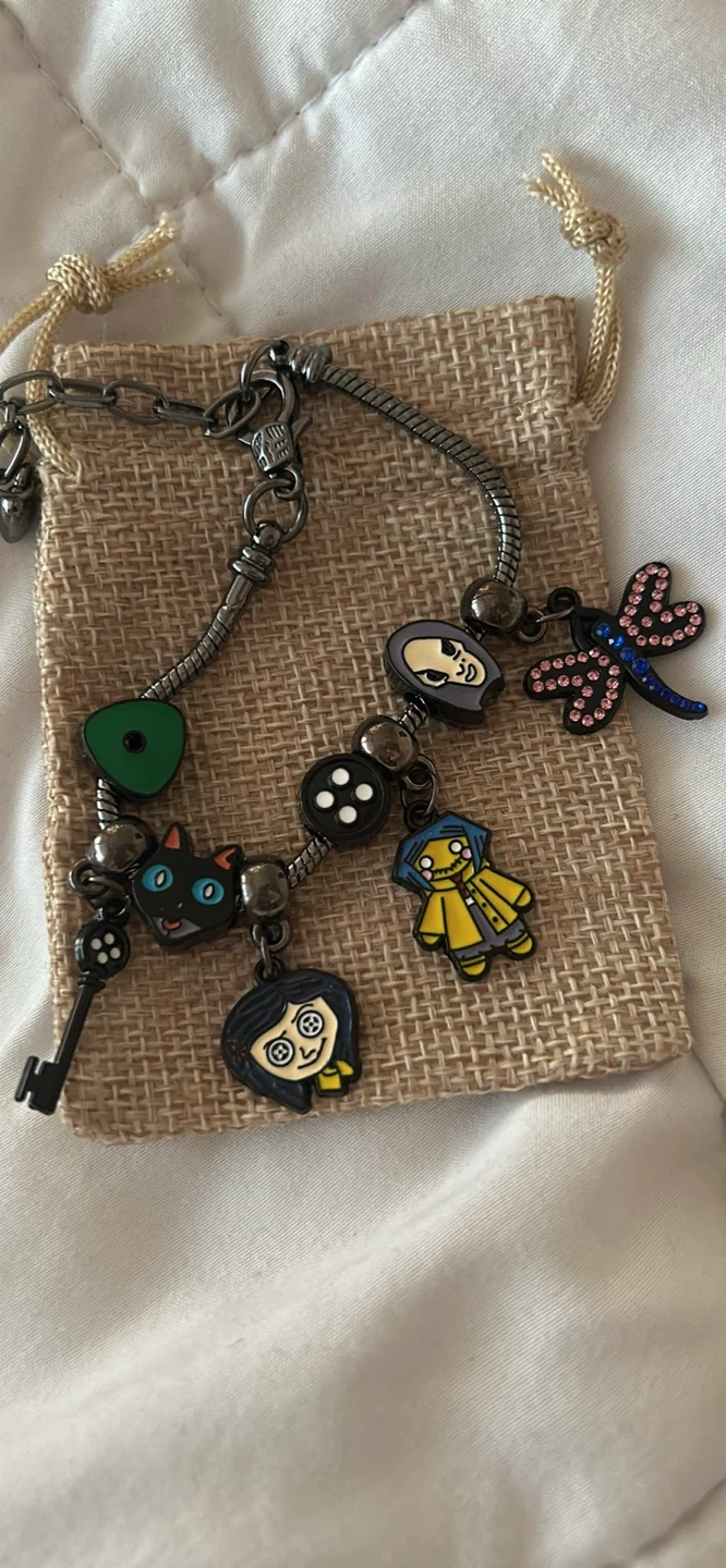 Here's a Coraline charm bracelet! It features several charms related to the movie Coraline, including Coraline herself, the cat, and other iconic symbols. It's a fun and unique piece for any fan!