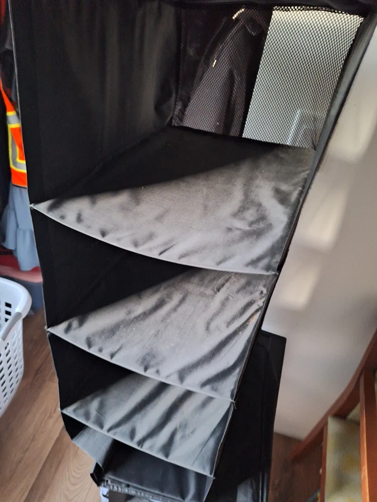 Selling a black hanging closet organizer! It has multiple shelves, perfect for storing clothes, shoes, or accessories. It's in great condition and ready to help you maximize your closet space