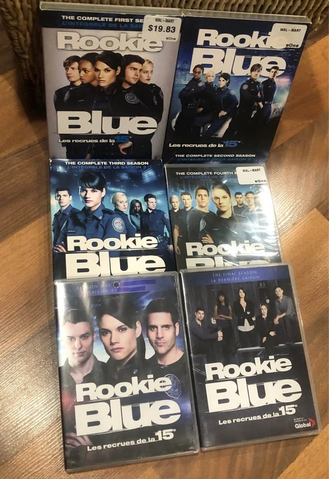 All seasons of Canadian police drama Rookie Blue on DVD. Seasons 2, 3, and 4 are still unopened (sealed).