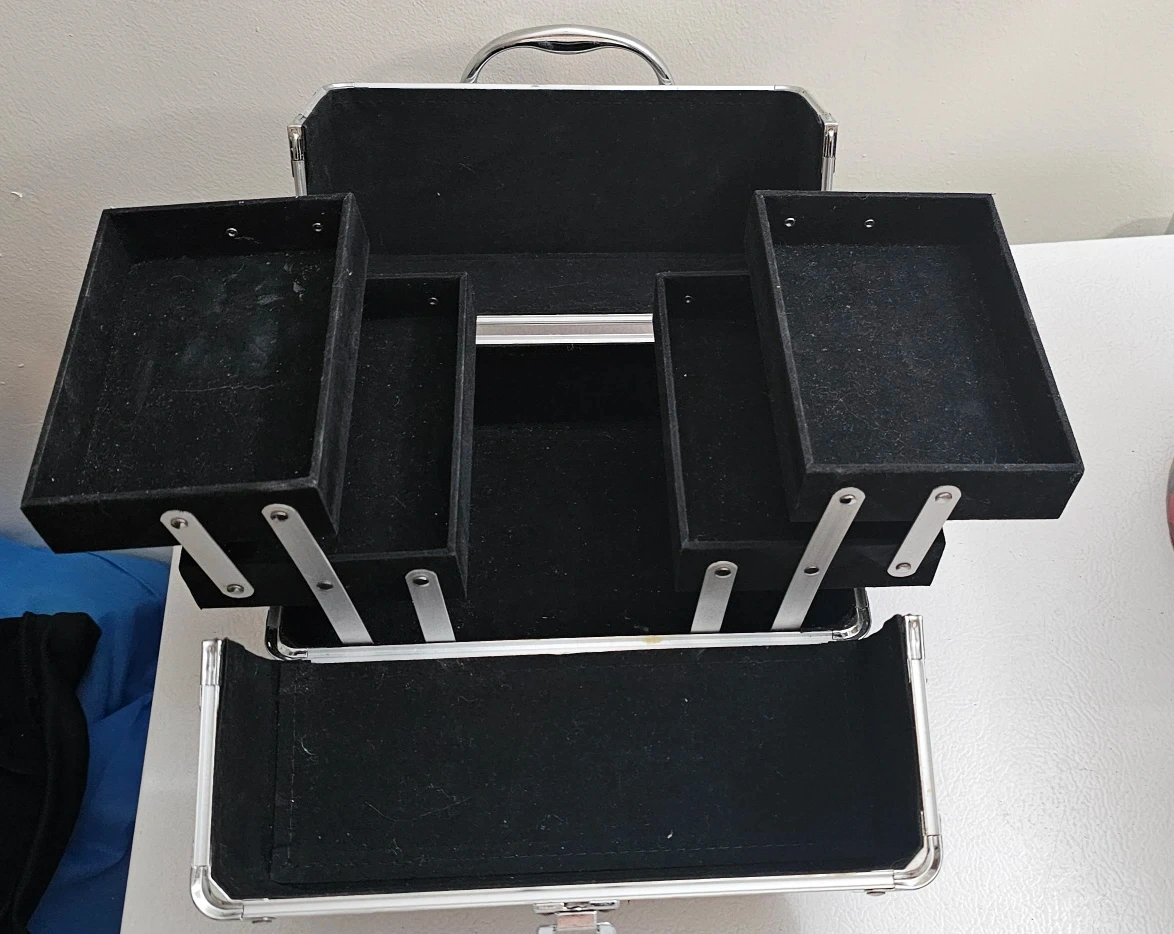 Selling a cute Hello Kitty makeup/cosmetic case! It has a silver aluminum frame and is covered in a Hello Kitty pattern. The interior is black and features multiple compartments for organizing your beauty products