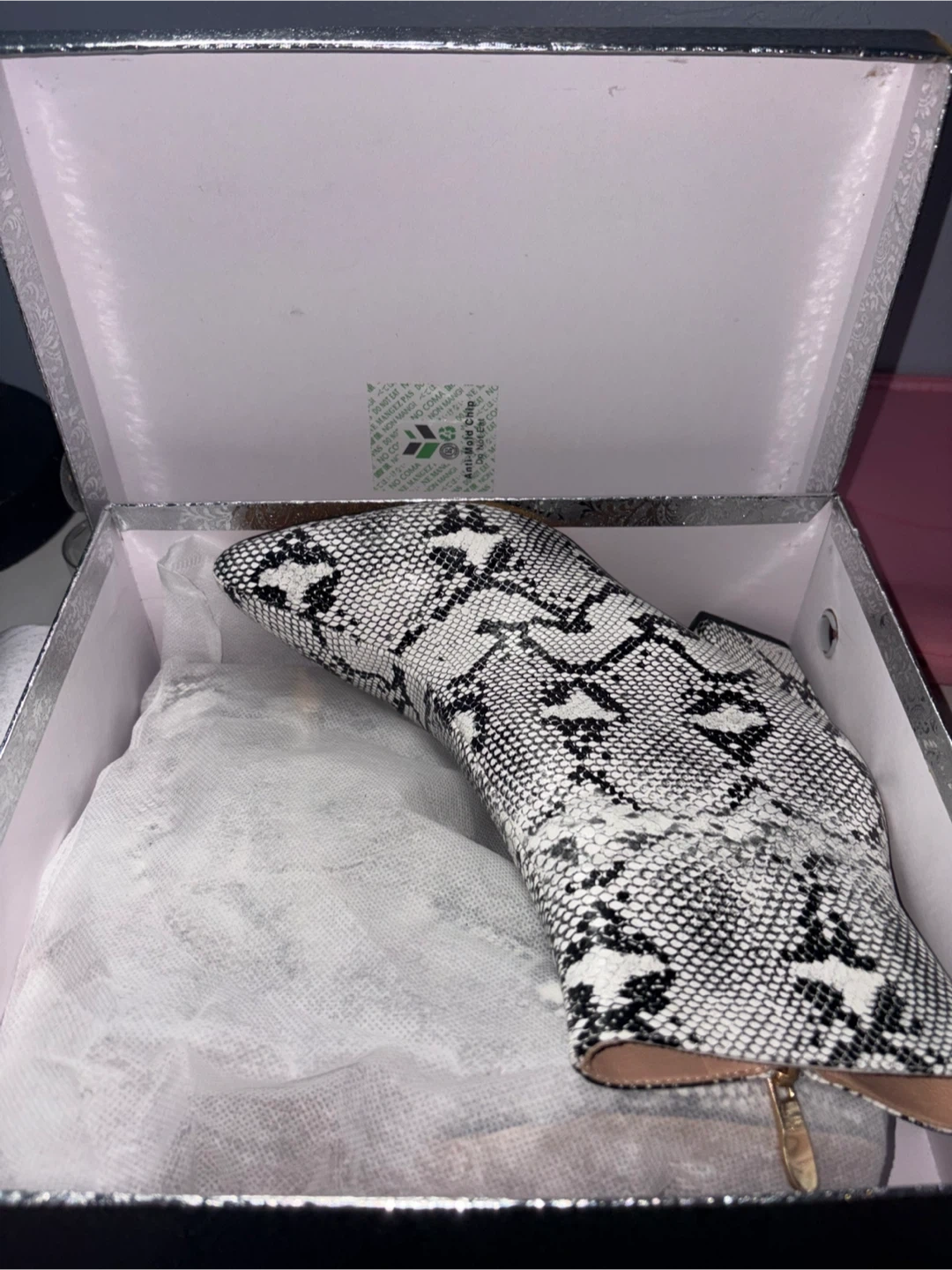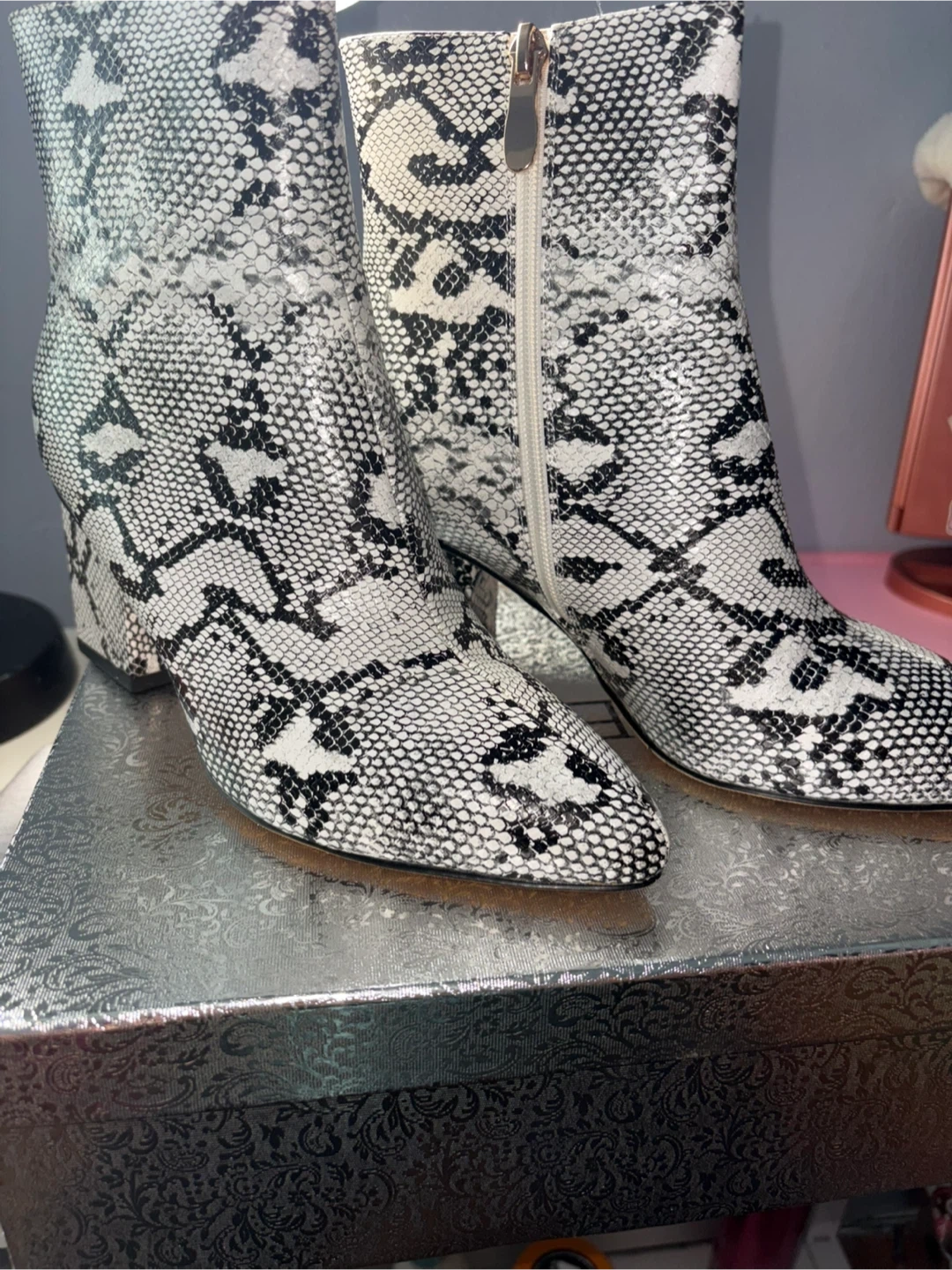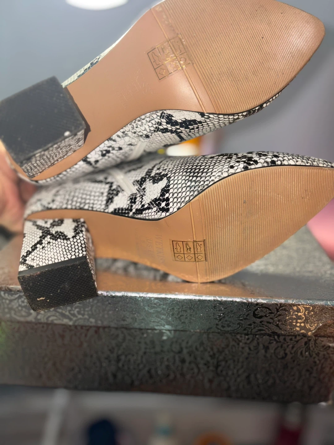 These booties feature a stylish snake print design! They are a slip-on style with a chunky heel. The size is US 8 / EU 39. Comes with the original box. Used once.