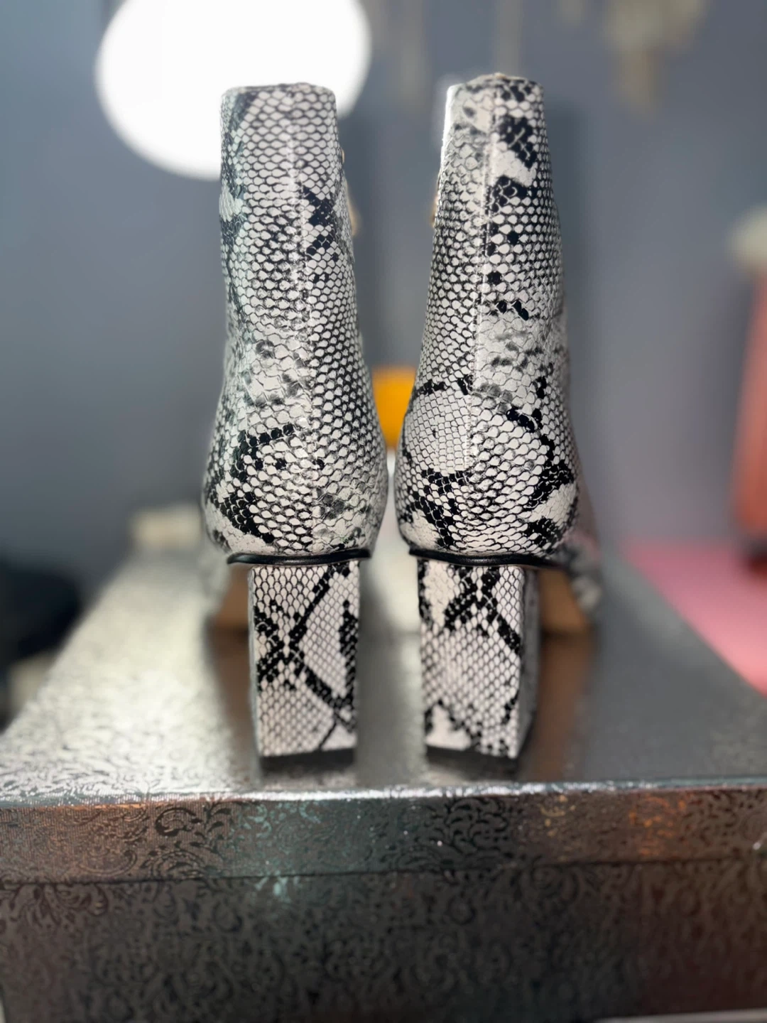Snake Print Chunky Heel Booties - US 8