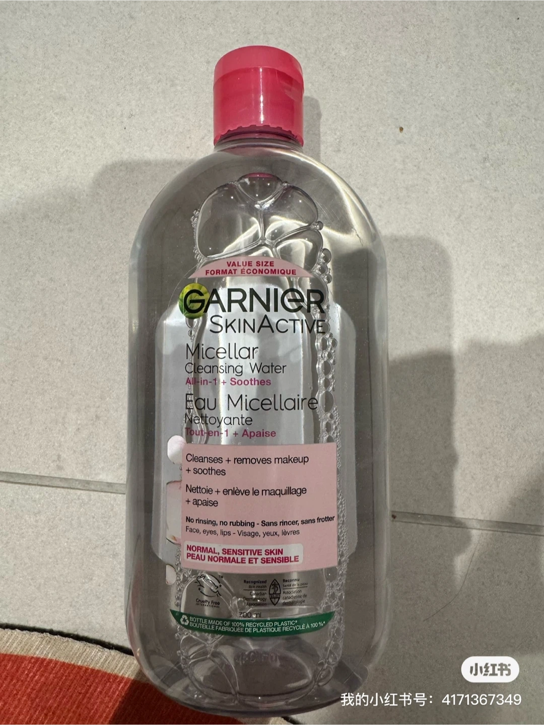 Selling a bottle of Garnier SkinActive Micellar Cleansing Water. It's the all-in-1 that cleanses and soothes! Perfect for normal and sensitive skin, and no rinsing or rubbing required. The bottle is made of 100% recycled plastic and contains 700ml of product