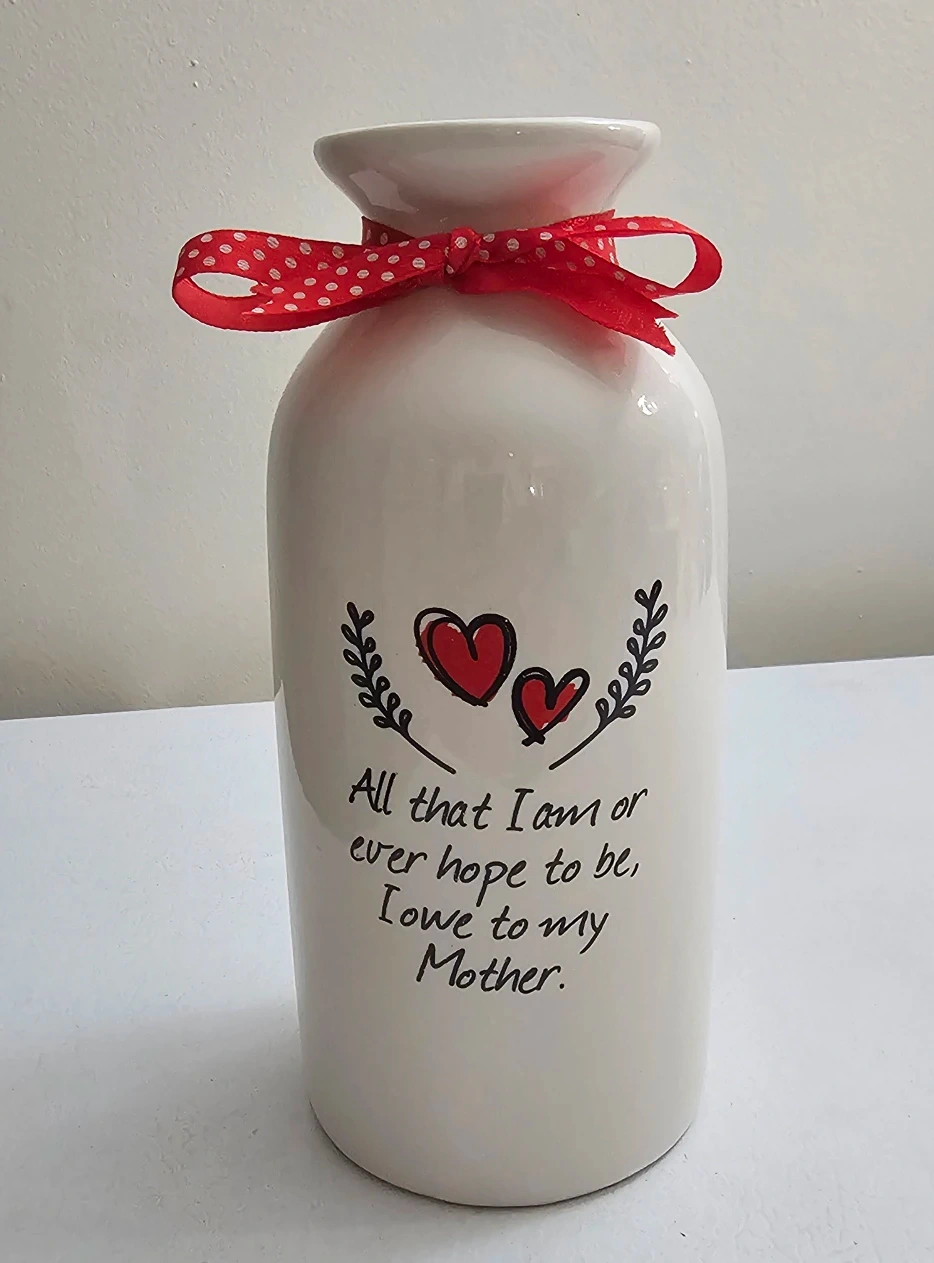 A lovely ceramic vase, perfect for displaying flowers or as a decorative piece! It features a sweet message: "All that I am or ever hope to be, I owe to my Mother", adorned with cute heart designs and a red polka-dot ribbon