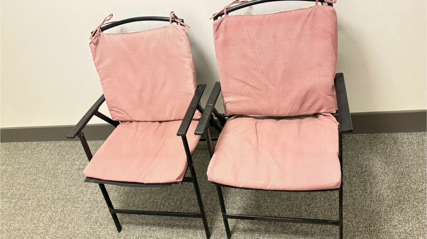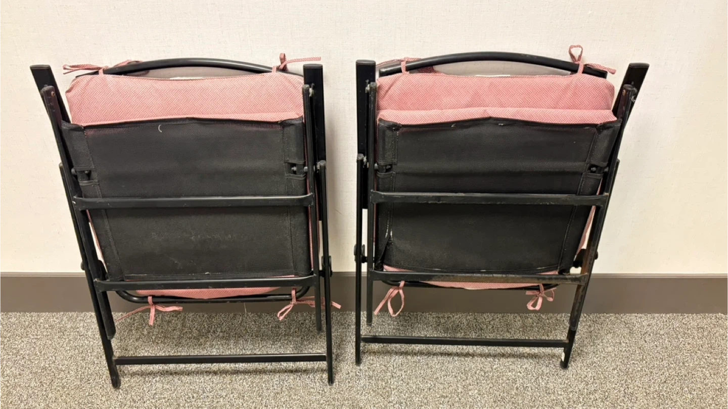 Selling a set of two folding chairs, each with a comfy pink cushion. The frames are black and the cushions tie on for easy removal. Great for extra seating!