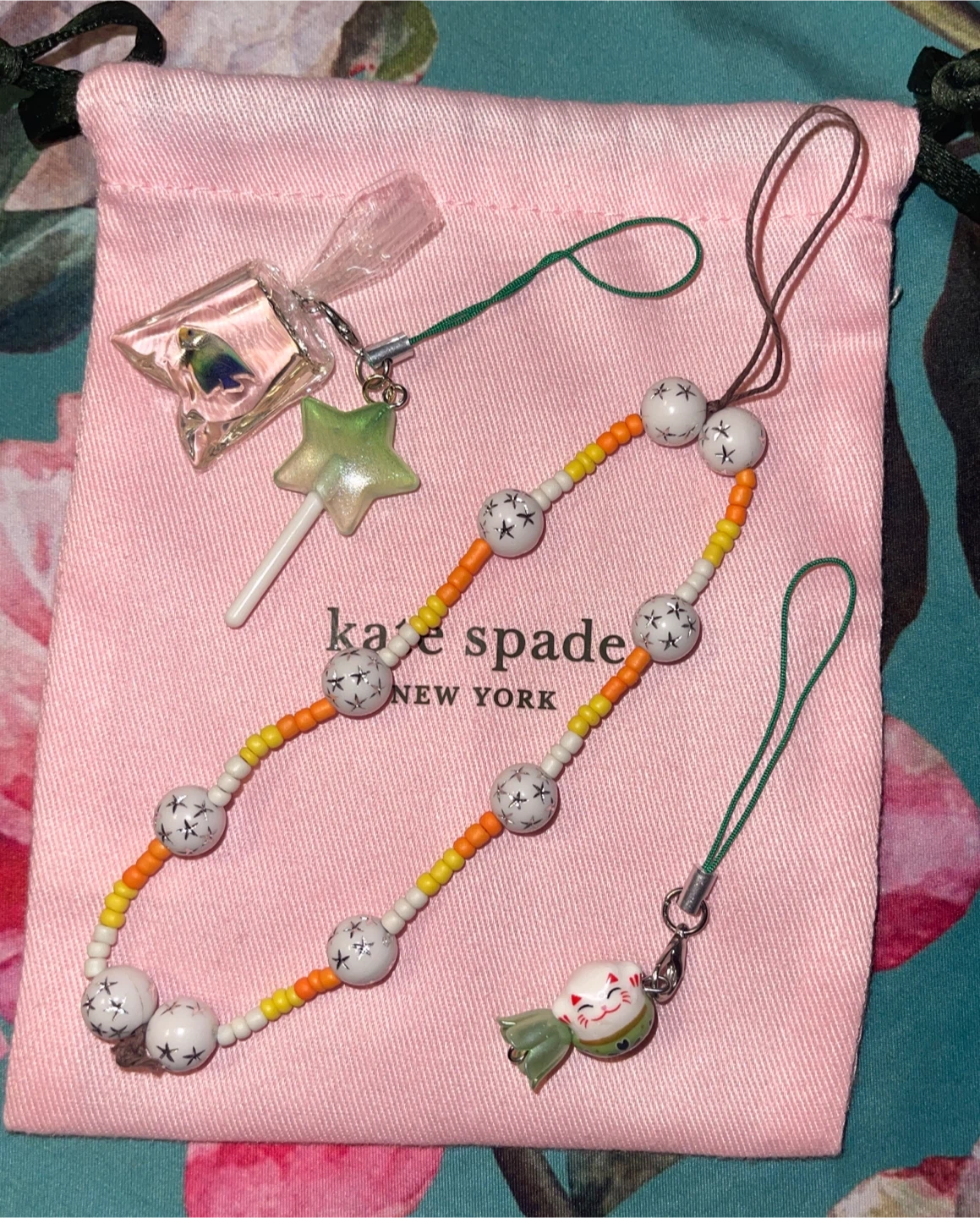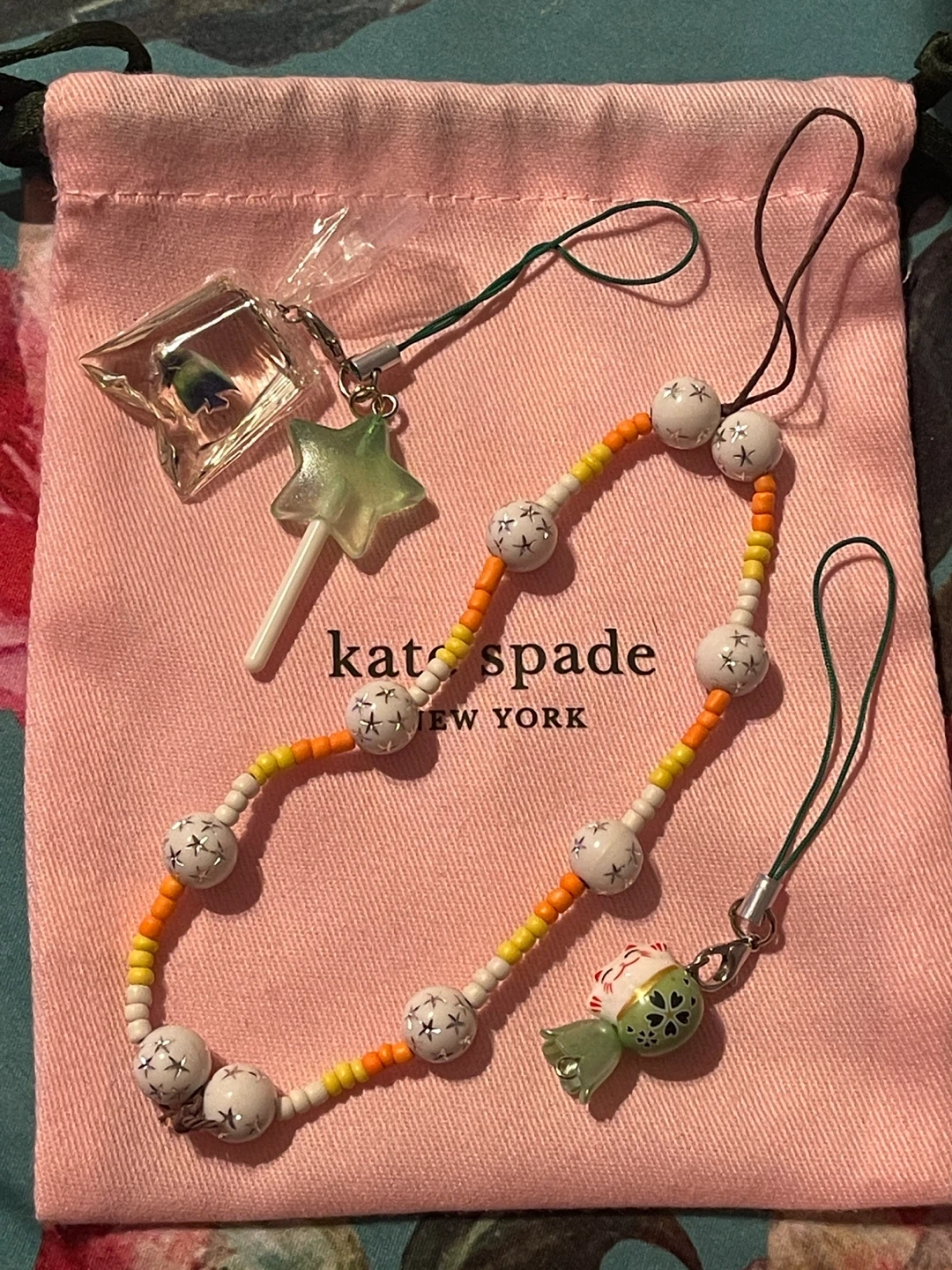 New, never used. Cute phone accessories. Charming trio set with colourful phone lanyard and phone charms. Features a star lollipop and a fish in a bag charm, lucky cat charm, and orange and yellow beaded star phone lanyard/ wristlet. Perfect for a playful style.