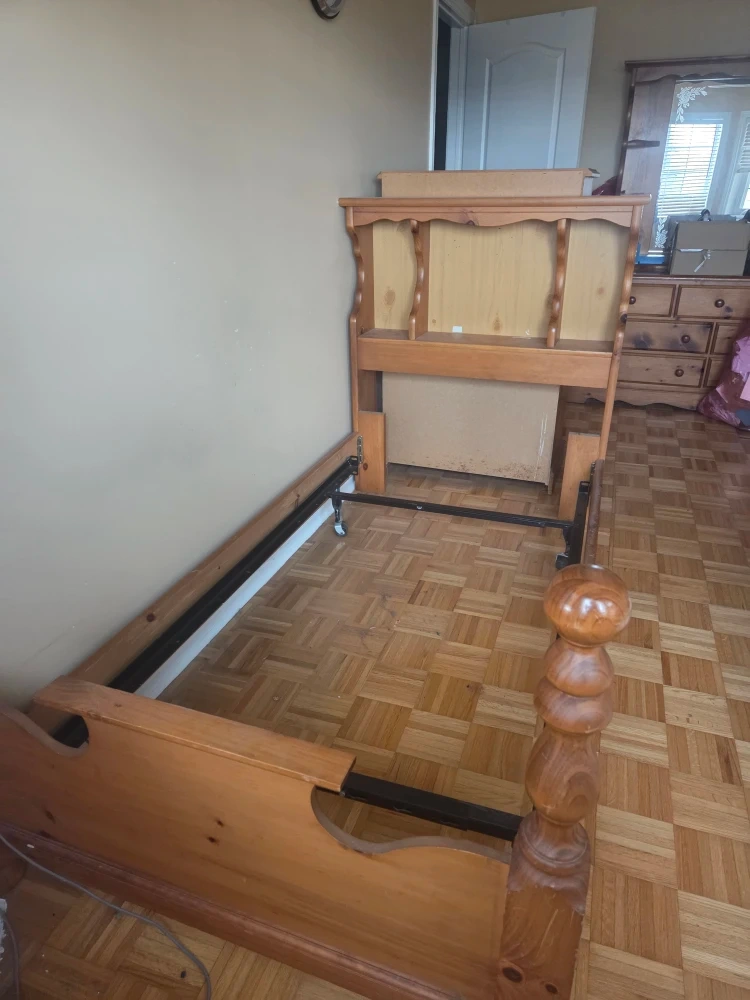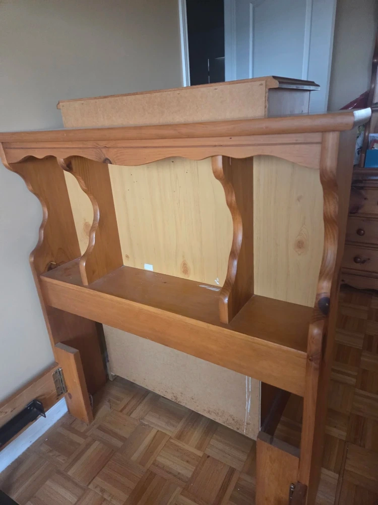 Selling a wooden bedroom set that includes a headboard, dresser, and mirror. The set is in good condition and ready for a new home. Perfect for adding a touch of warmth to your bedroom!