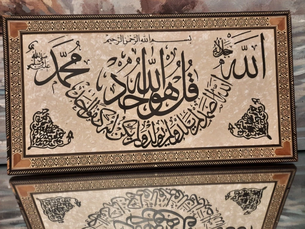 This is a beautiful piece of Islamic calligraphy art. It features elegant script and intricate designs within a decorative frame. A lovely addition to any home!