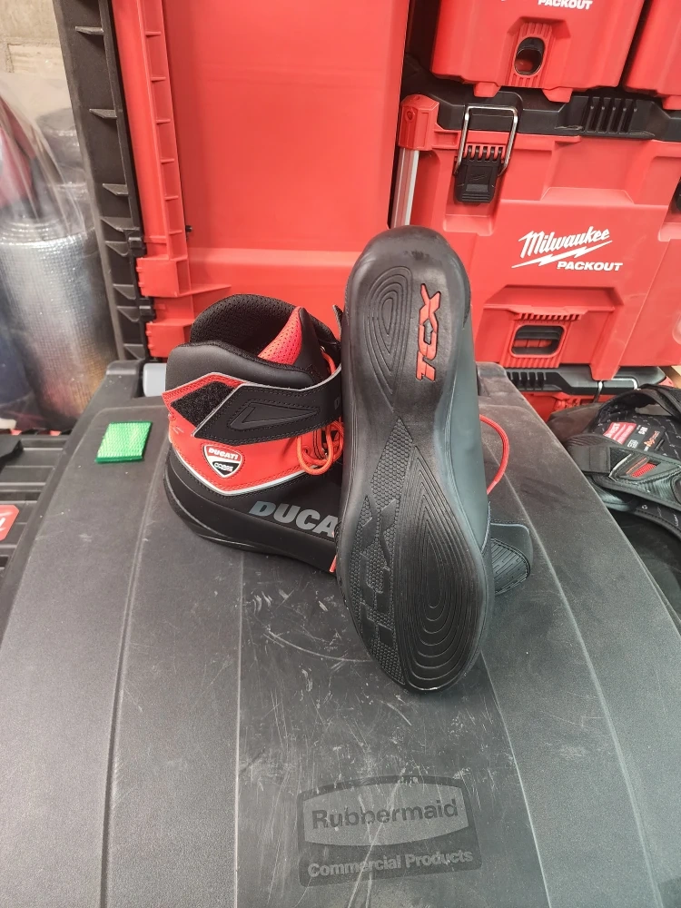 Selling a pair of Ducati Corse TCX boots in US size 11. These are in great shape and ready for the road! The boots are black and red with the Ducati Corse logo.