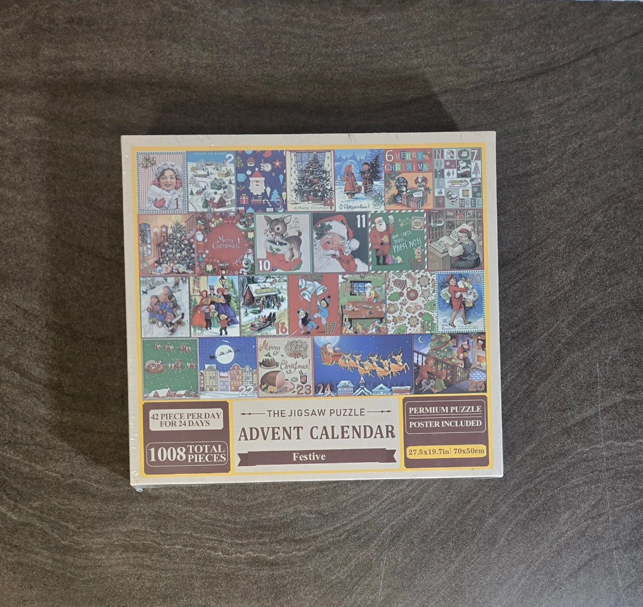 New in sealed plastic. Contains 1008 pieces and includes a premium poster. Each day reveals a new image for 24 days, with 42 pieces per day. The assembled puzzle measures 27.5 x 19.7 inches (70x50cm). Great for some festive fun. Cross-posted.