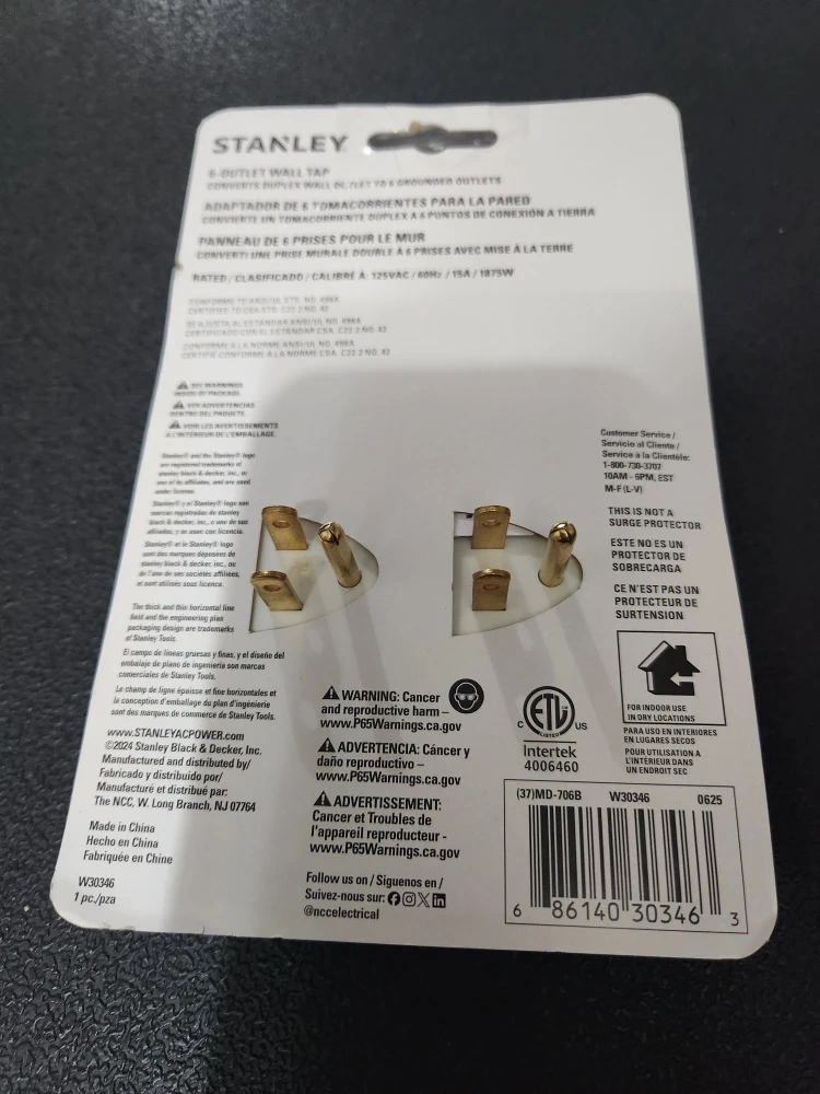 Selling a brand new Stanley wall tap adapter. It features 6 grounded outlets and is rated/calibrated for 125VAC/60Hz/15A/1875W. Perfect for indoor use in dry locations!