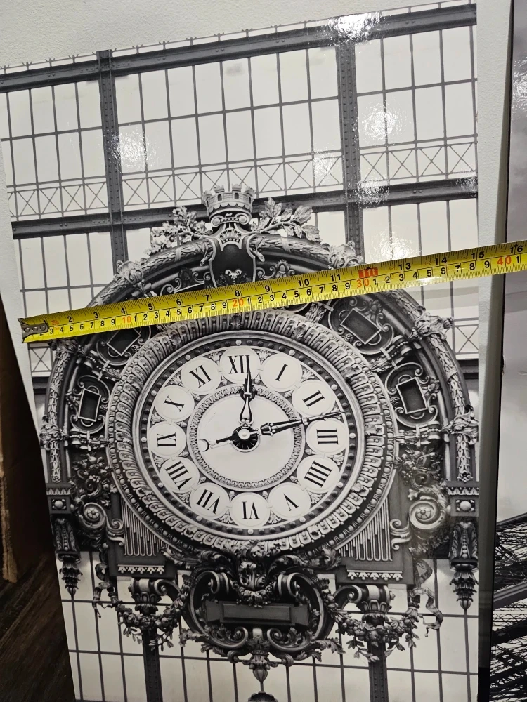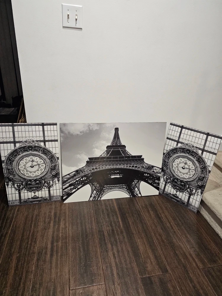 Selling a set of wall art (6 pieces)featuring Paris scenes. There's one of the Eiffel Tower and two with ornate clocks. Measurements in the pictures