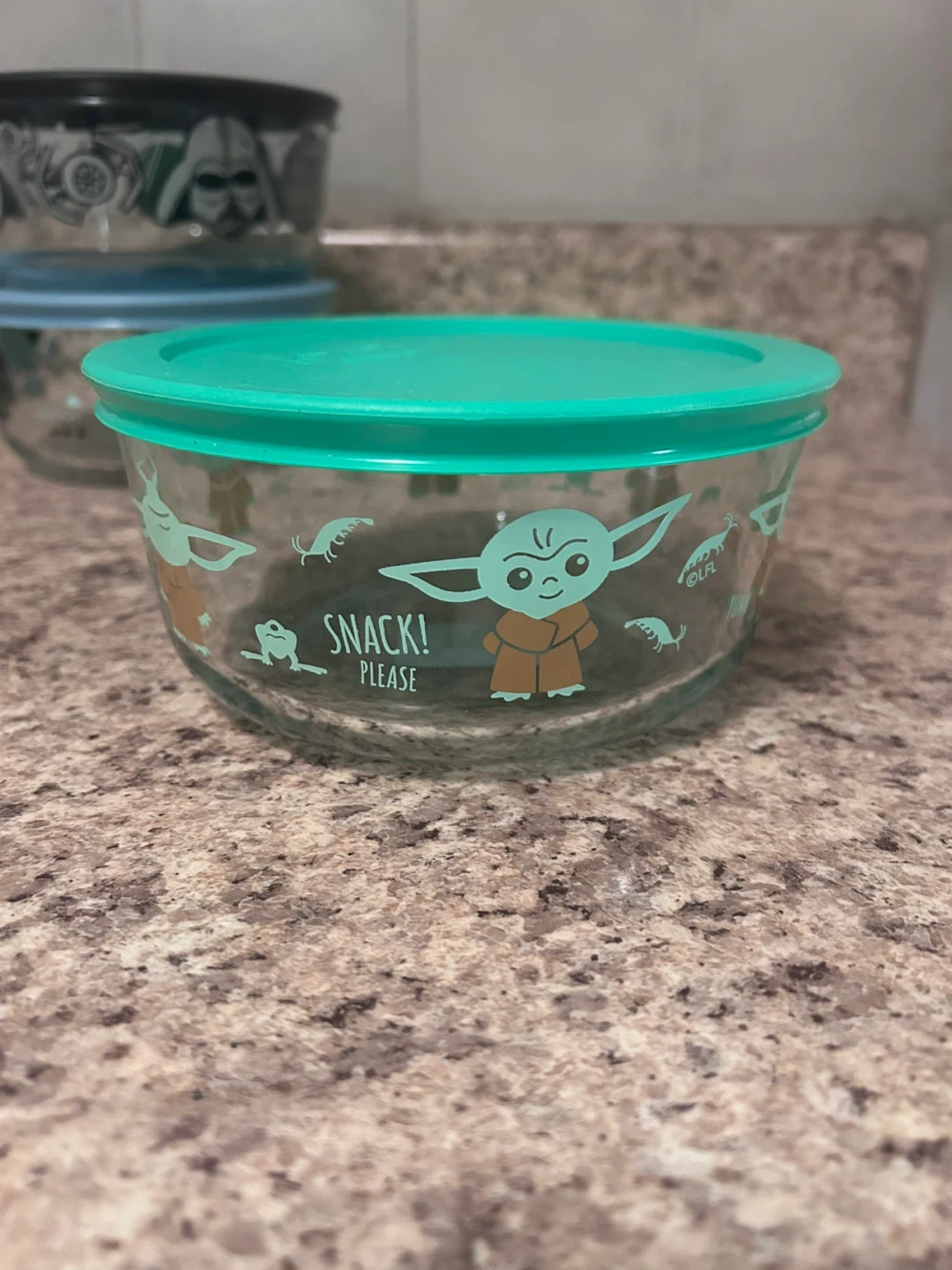 New Pyrex 4-cup glass storage bowl with Star Wars The Mandalorian Grogu design.