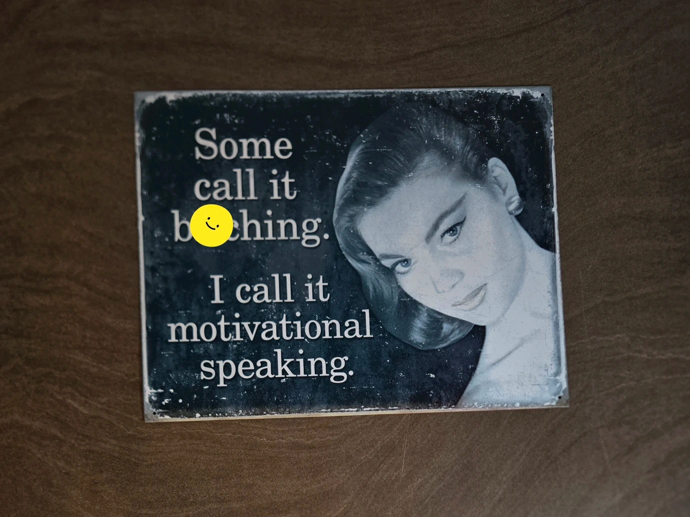 Excellent condition. Ready to hang. 16" wide and 12.5" tall. Tin motivational wall decor features a vintage-style design with the phrase "Some call it b**ching. I call it motivational speaking" printed on it. Cross-posted.