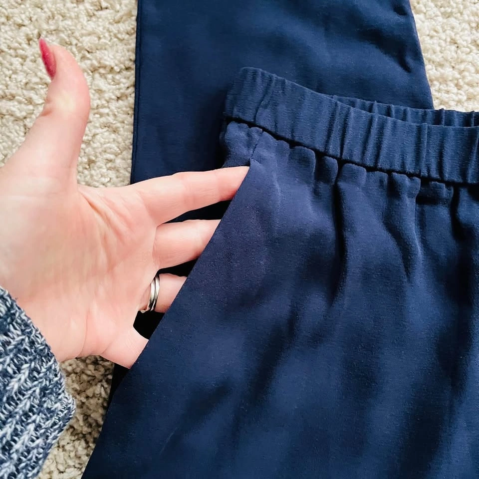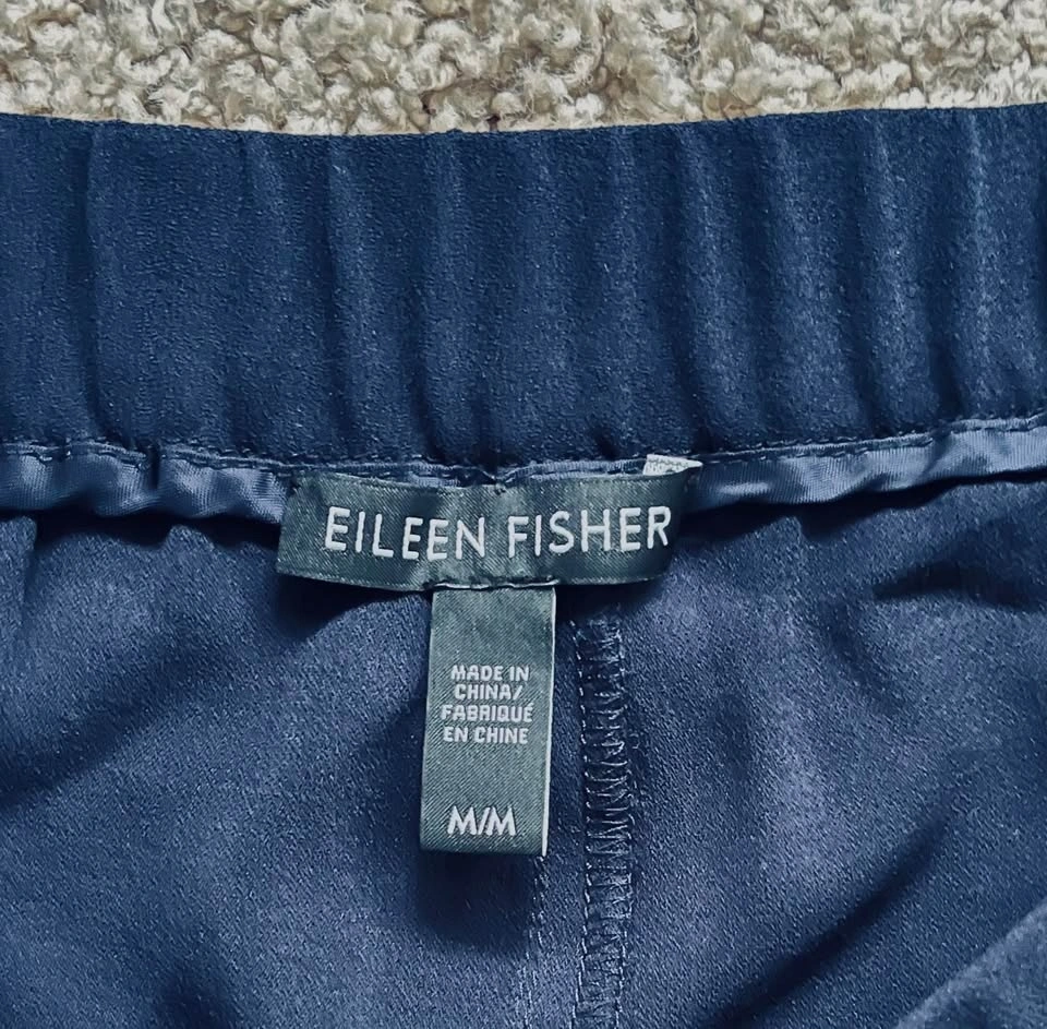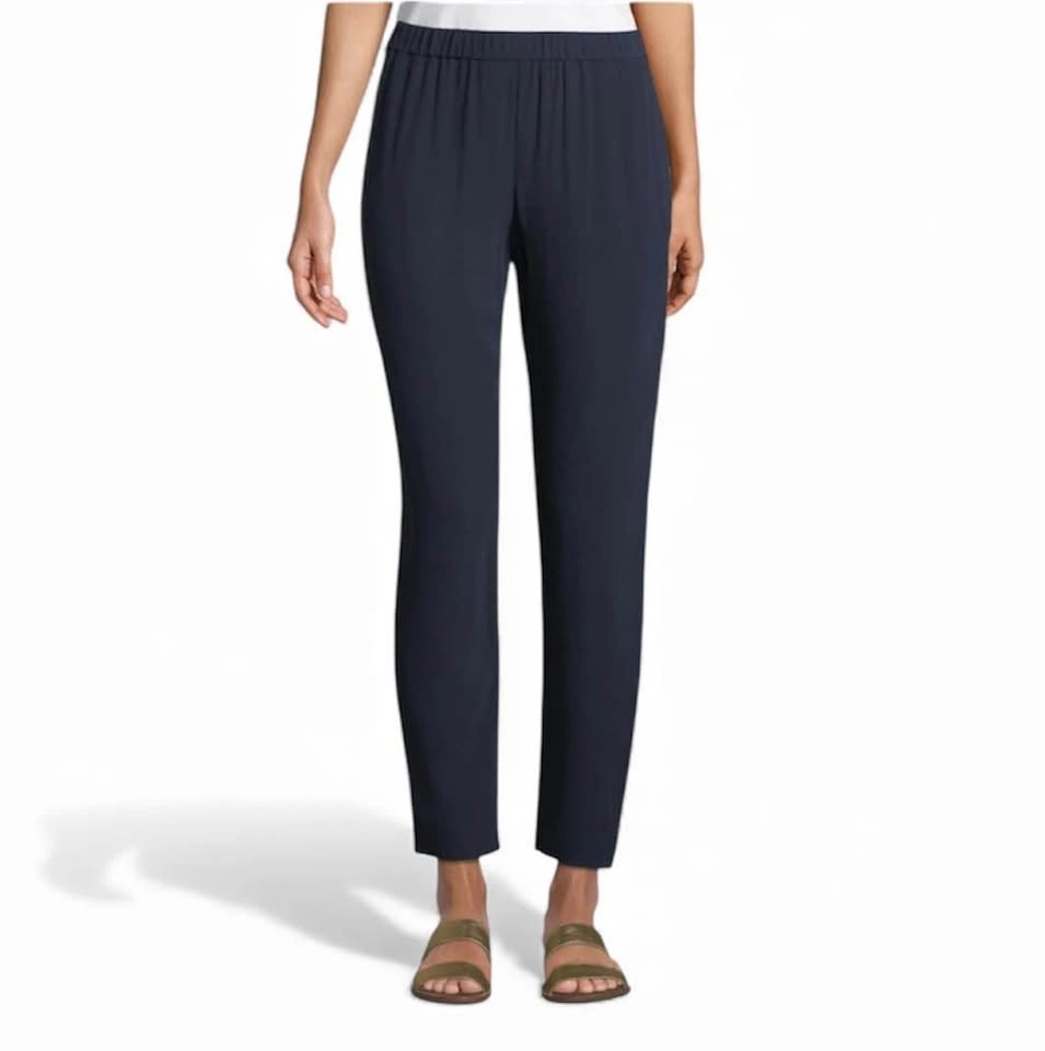 Eileen Fisher Silk Georgette Crepe Slouchy Machine Washable Ankle Pants in classic navy blue. These gorgeous pants are in excellent pre-loved condition; the model photo is included to illustrate fit and style only.
