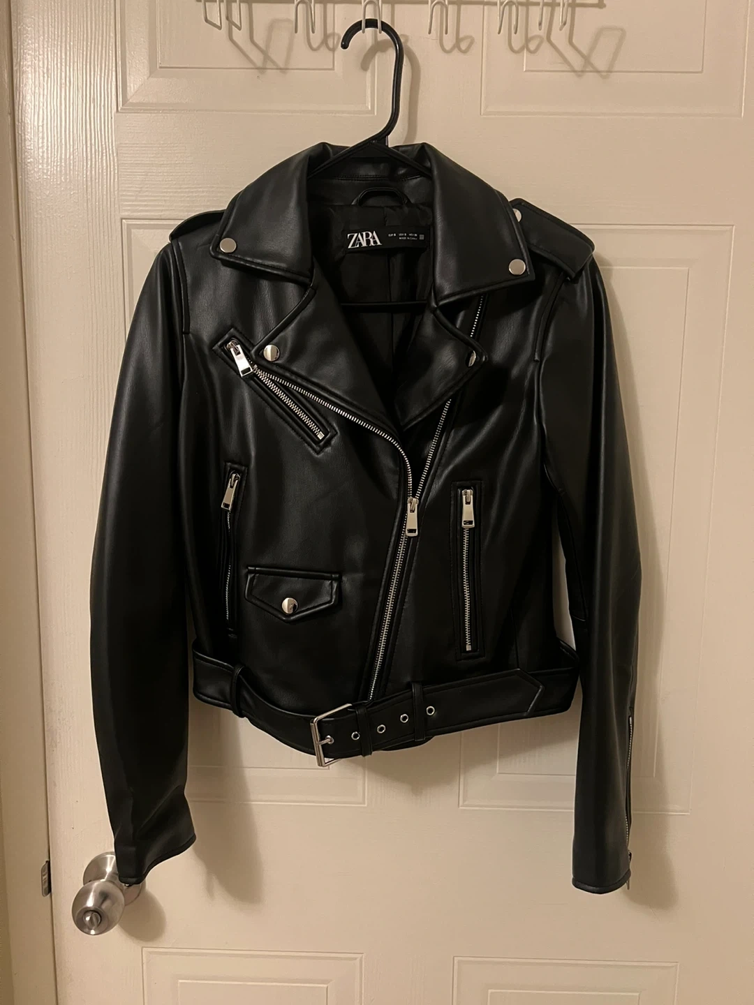 Lapel collar jacket with long sleeves, zippered cuffs, and epaulettes. Front zip pockets. Buckle belt at hem. Front crossover metal zip closure.