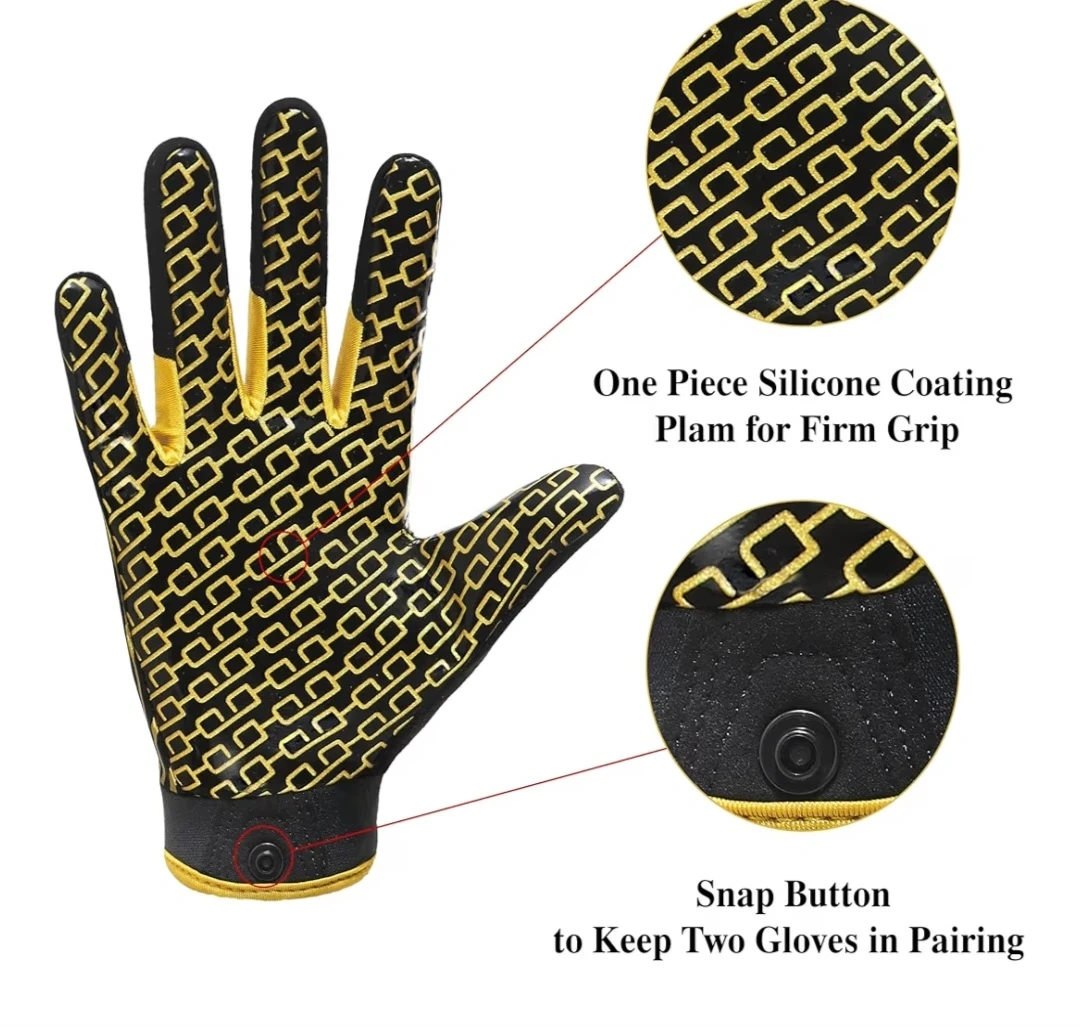 Get ready to catch some passes with these Handlandy youth football receiver gloves! They feature a one-piece silicone coating on the palm for a firm grip, and an adjustable closure to ensure a perfect fit. The terry cloth is great for wiping away sweat, and the snap button helps keep the gloves paired together. Size M.