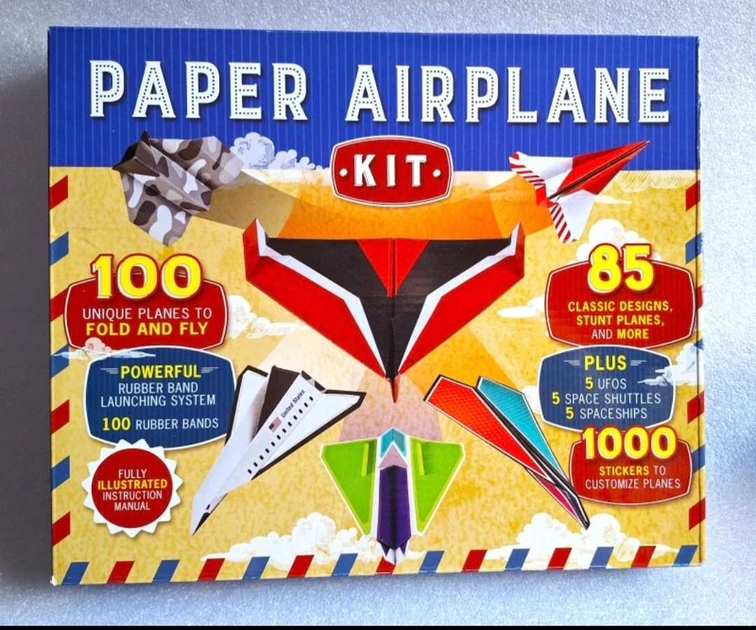 Get ready for some high-flying fun with this paper airplane kit! It's perfect for kids and adults alike who love to fold, customize, and launch their own unique planes. The kit includes everything you need to create 100 different airplane designs, with 85 classic styles and more. Plus, there are over 1000 stickers to personalize your creations! It also includes a 36-page booklet with basic aerodynamics, tips and tricks, and step-by-step folding instructions