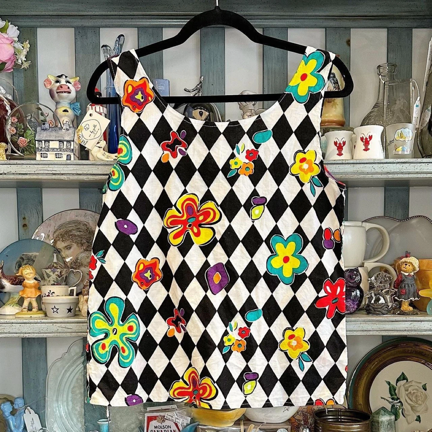 Vintage 80s funky black and white checker patterned tank top with rainbow psychedelic flowers